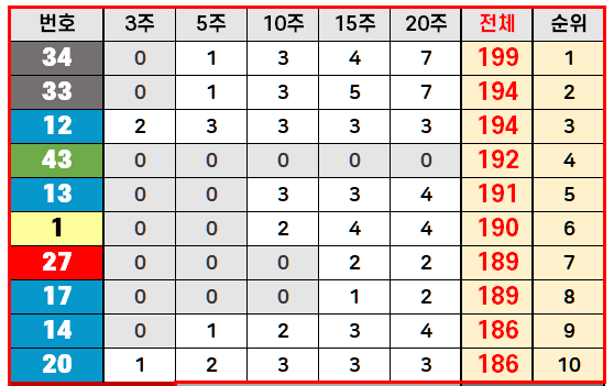 - 19번: 최근 10주간 4회 출현한 최다 당첨번호