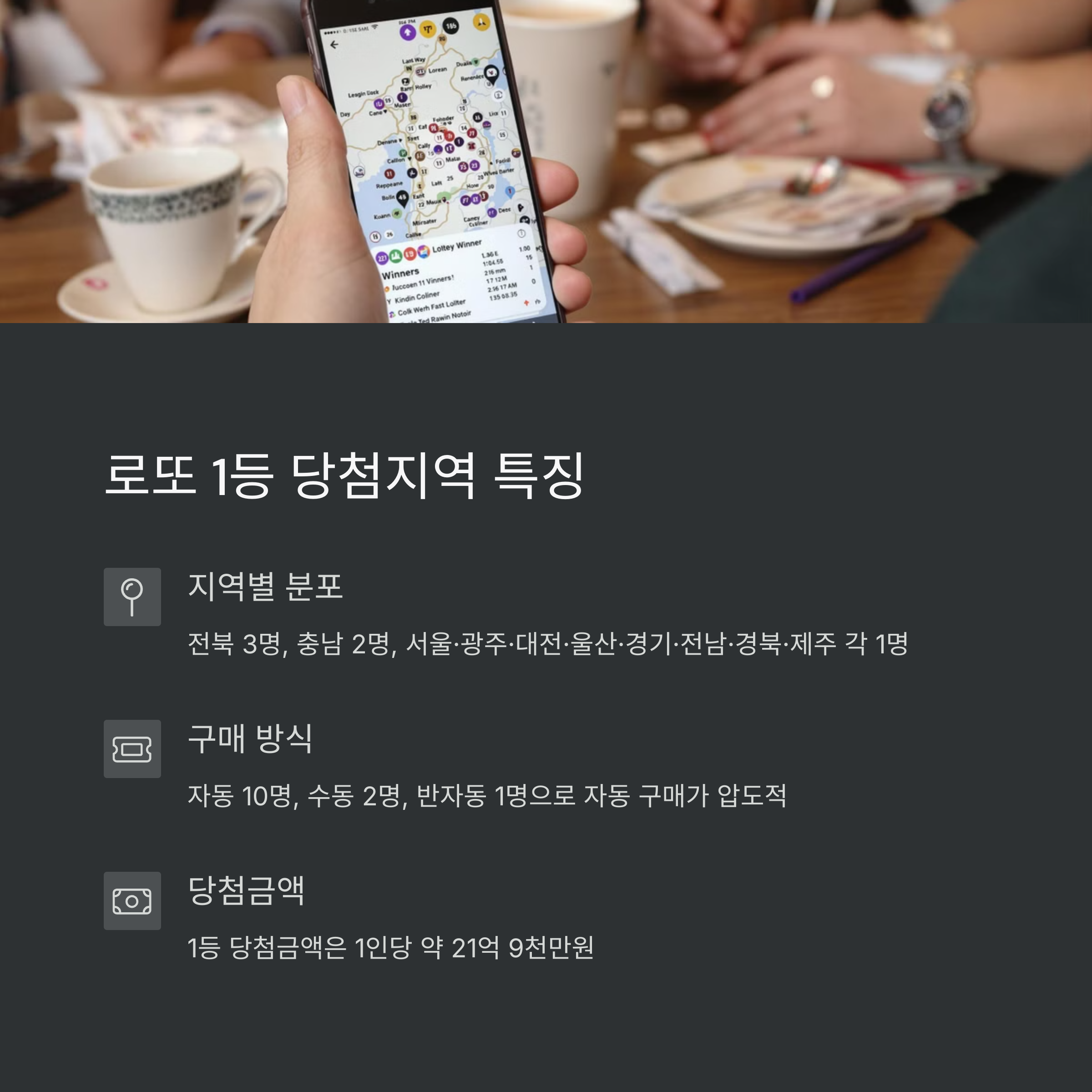 구매 방식별로는 자동 10명, 수동 2명, 반자동 1명으로, 자동으로 구매한 사람들이 가장 많이 당첨되었습니다. 이는 대부분의 사람들이 자동으로 로또를 구매하는 경향이 있기 때문이기도 합니다. 1등 당첨금액은 1인당 약 21억 9천만원이었습니다.