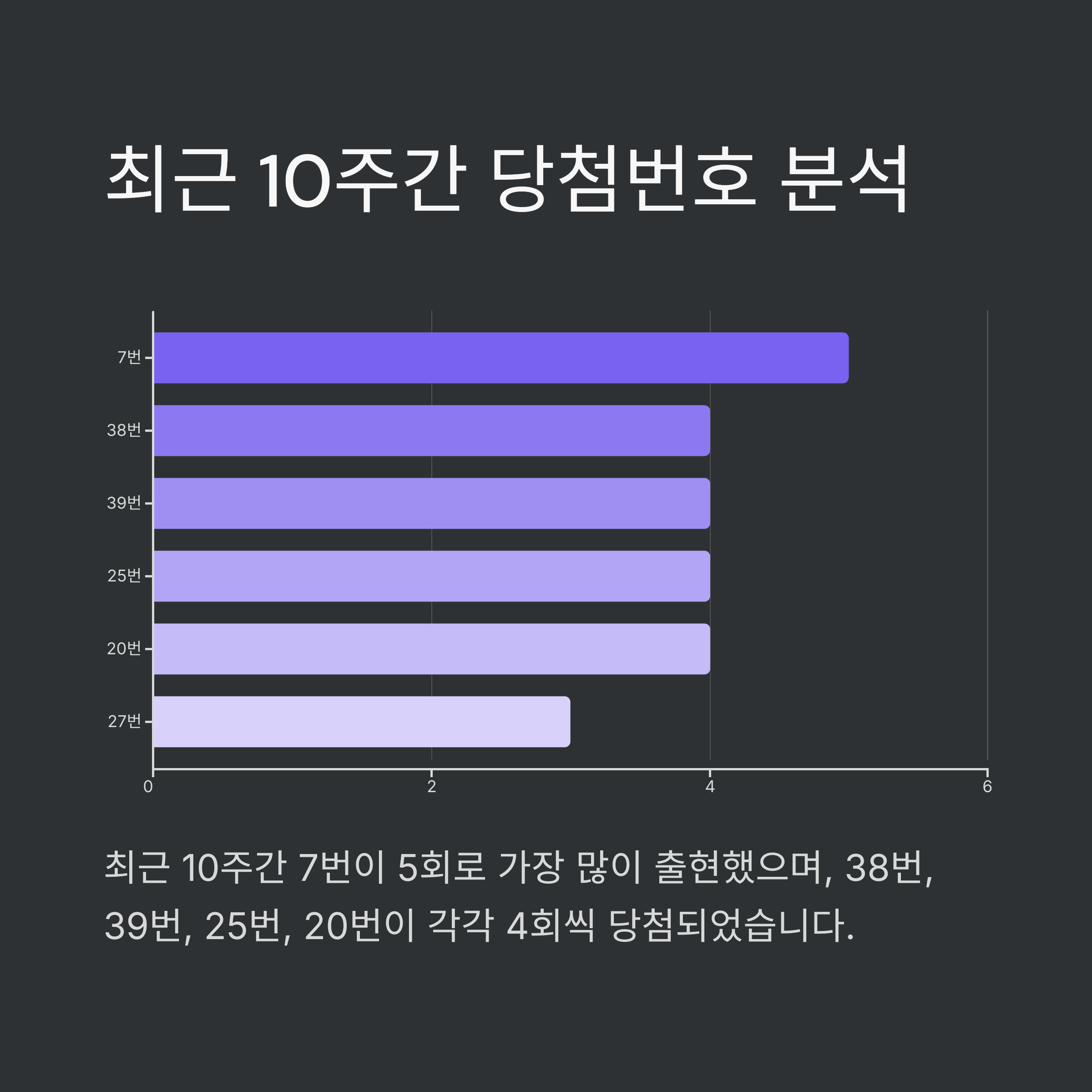 1165회까지의 최근 10주 통계에 따르면, 가장 많이 당첨된 번호는 7번으로 총 5회나 출현했습니다. 그 다음으로는 38번, 39번, 25번, 20번이 각각 4회씩 당첨되었고, 27번, 45번, 28번이 각각 3회씩 당첨되었습니다.