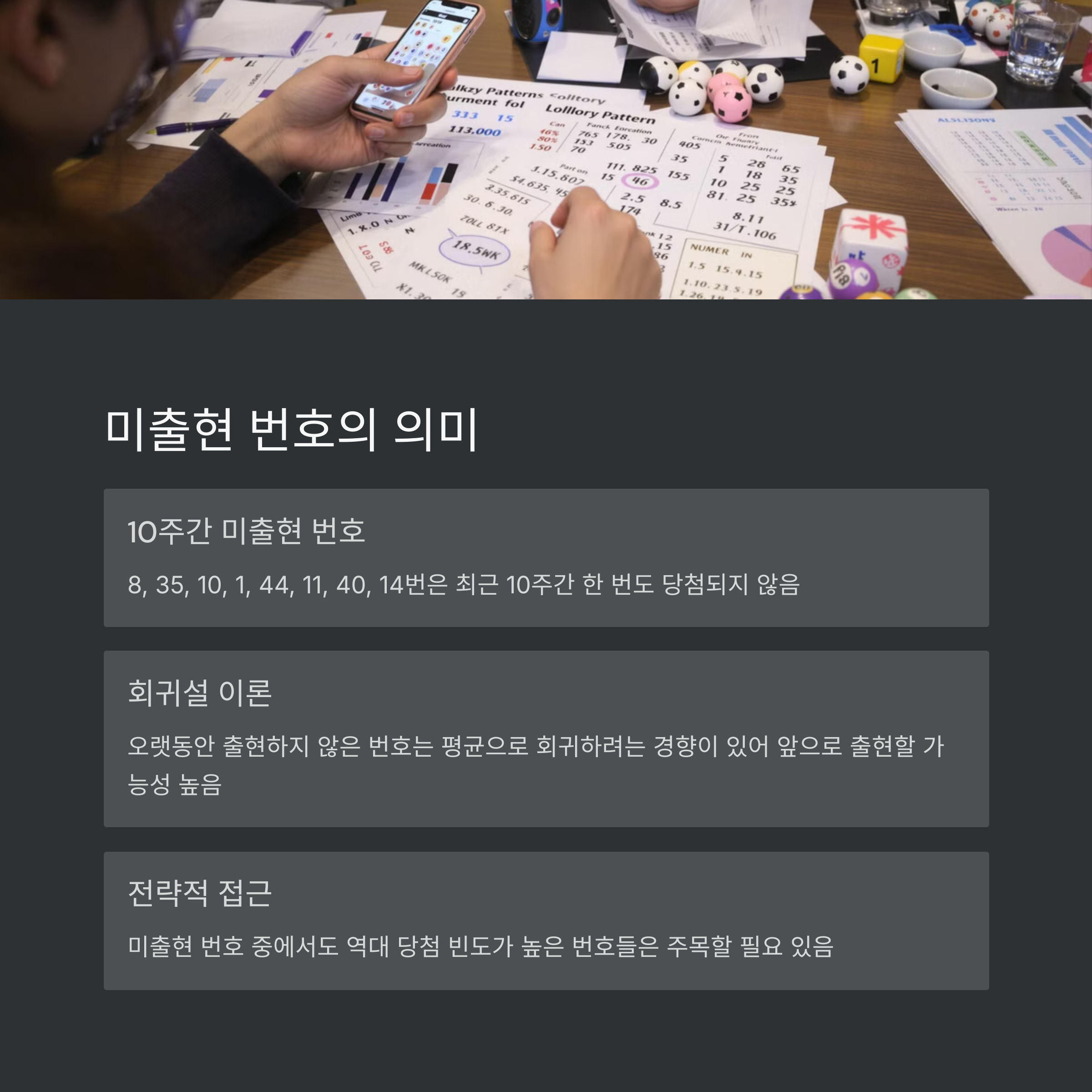 이후로는 미출현 번호를 무조건 배제하는 전략보다는, 역대 당첨 빈도와 함께 고려하는 접근법을 취하고 있습니다. 실제로 1번은 역대 8번째로 많이 당첨된 번호(191회)인데, 일시적으로 출현하지 않았던 것일 뿐이었죠.
