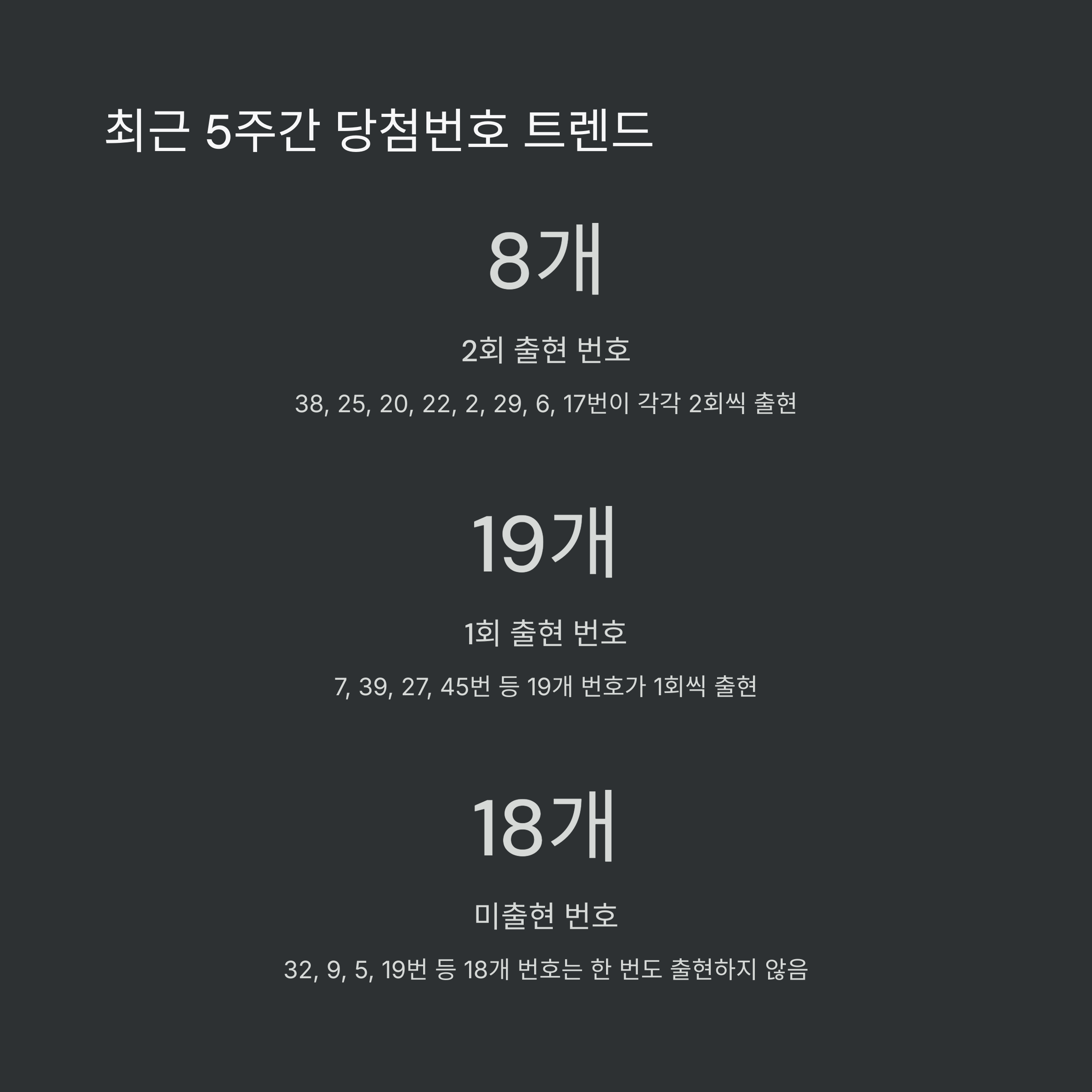 1165회까지의 최근 5주 통계를 보면, 당첨횟수가 2회인 번호는 38번, 25번, 20번, 22번, 2번, 29번, 6번, 17번으로 총 8개입니다. 이 번호들은 최근의 추세를 반영하므로 예상번호 선정 시 고려해볼 만합니다.