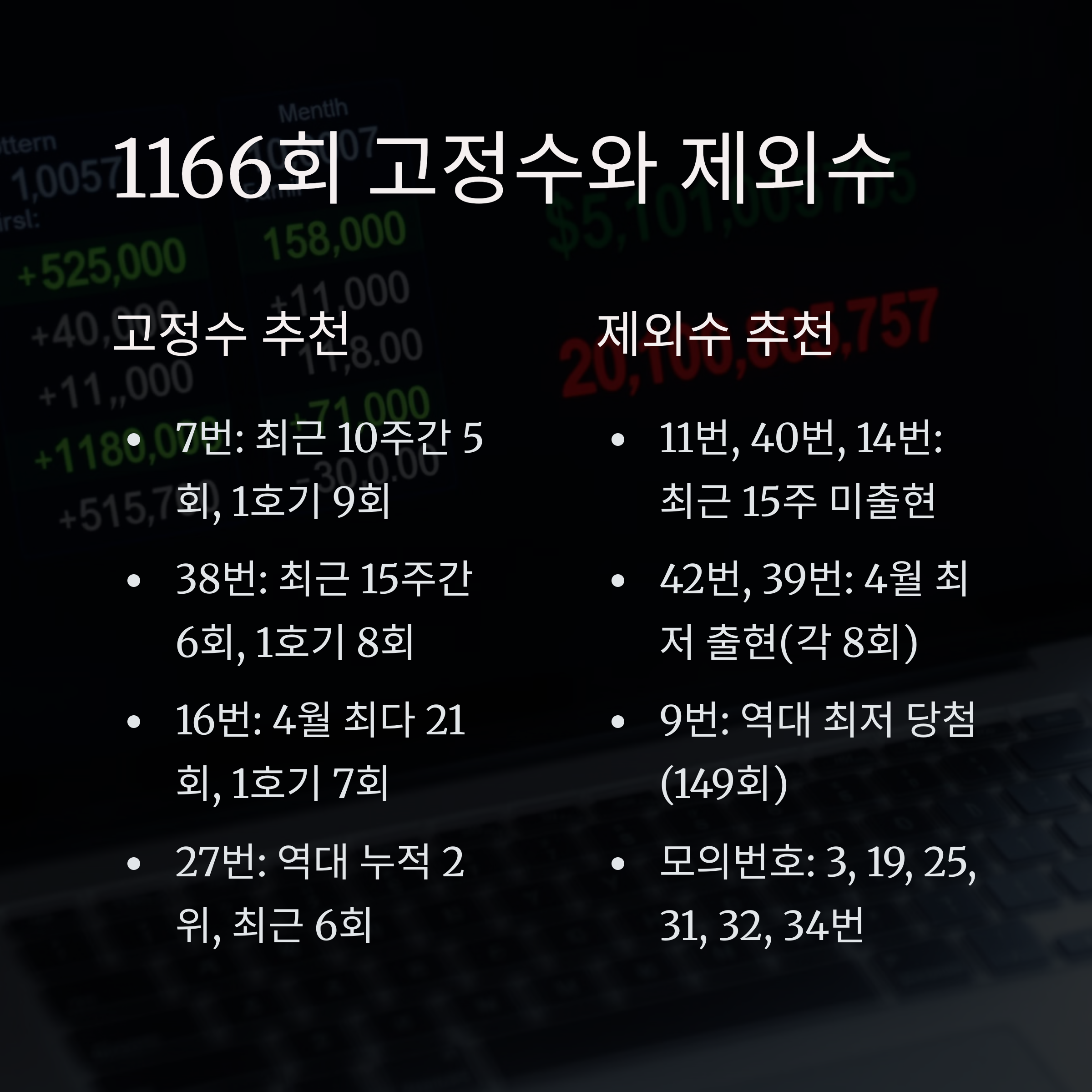 로또 예상번호 생성 시 효과적인 고정수와 제외수 설정은 당첨 확률을 높이는 데 중요한 역할을 합니다. 1166회를 위한 최적의 고정수와 제외수는 다음과 같습니다.
