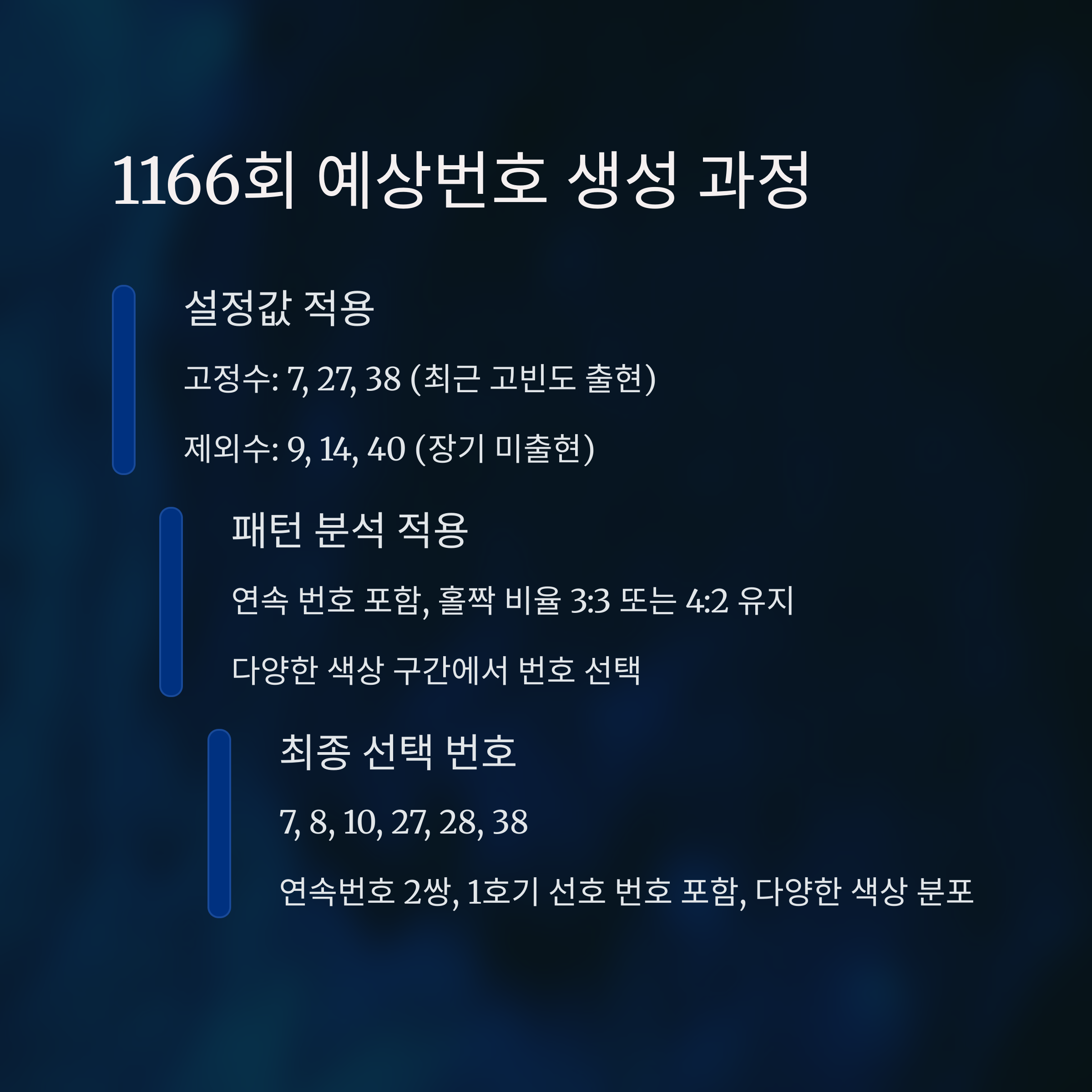 - 고정수: 7, 27, 38 (최근 15주간 고빈도 출현)
