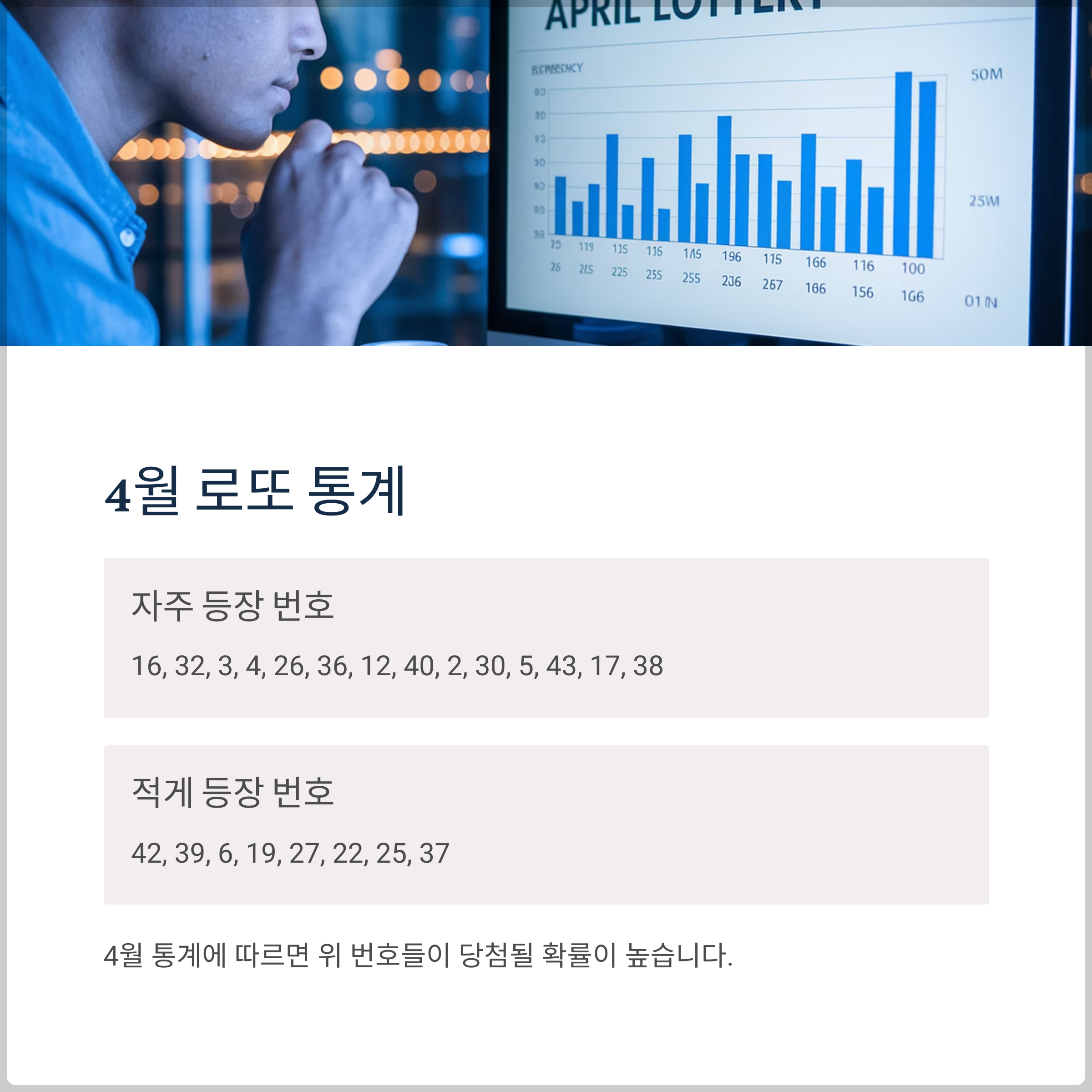 4월 통계에 따르면 16, 32, 3, 4, 26, 36, 12, 40, 2, 30, 5, 43, 17, 38번이 4월에 당첨될 확률이 높습니다.