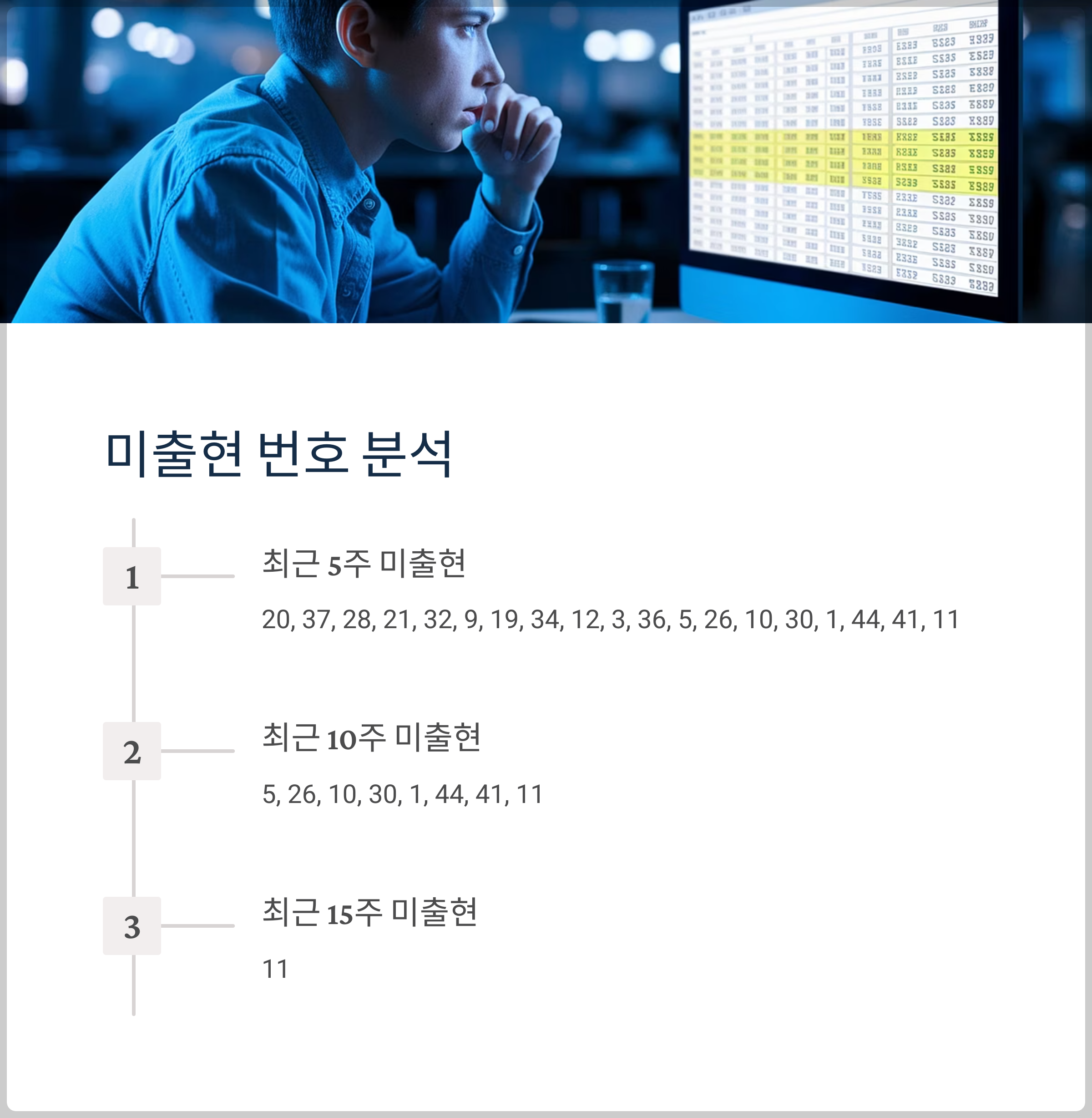 3. 최근 미출현 번호: 최근 5주~15주간 미출현 번호 중 당첨 가능성이 높은 번호들을 선택