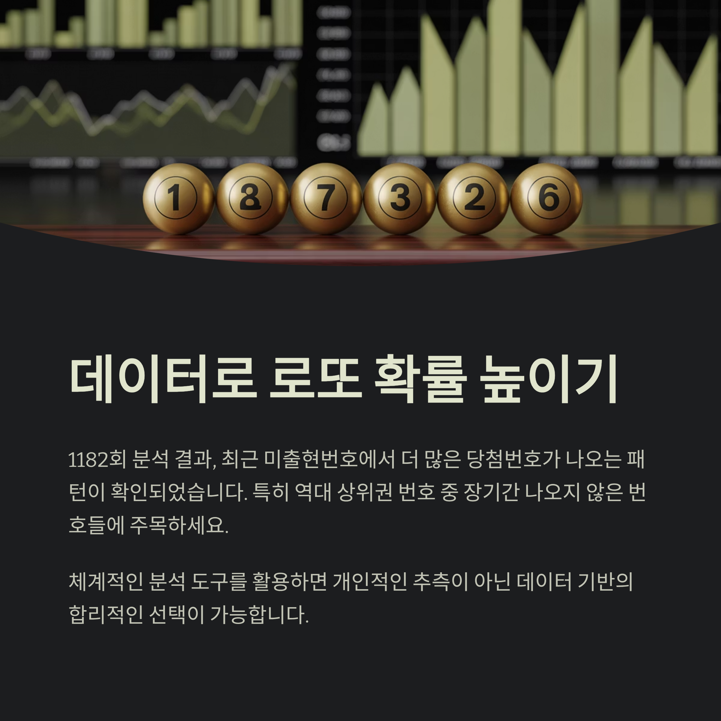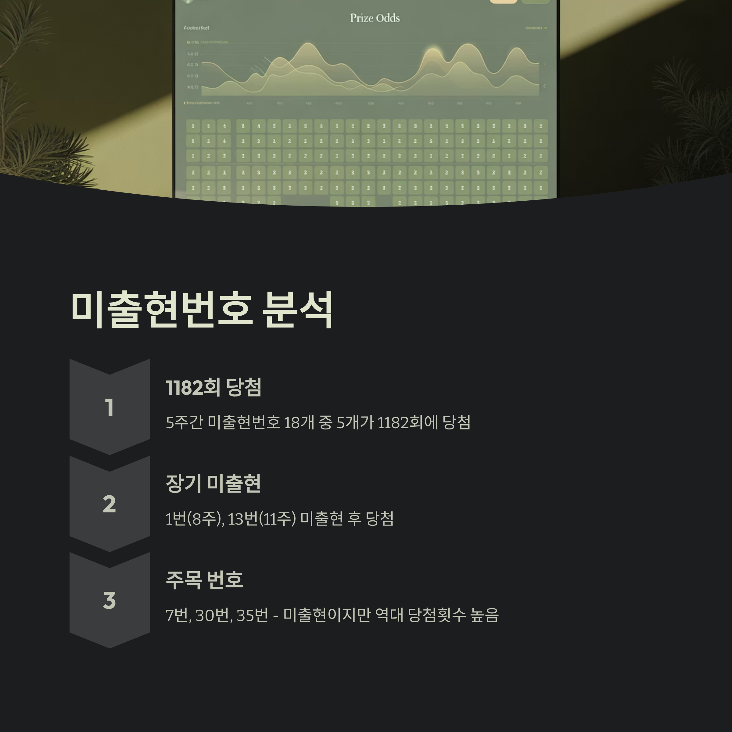 1182회 로또 분석을 통해 확인한 것은 최근 미출현번호에서 더 많은 당첨번호가 나오는 패턴입니다. 특히 역대 상위권 번호 중 장기간 나오지 않은 번호들에 대한 관심이 필요한 시점입니다.