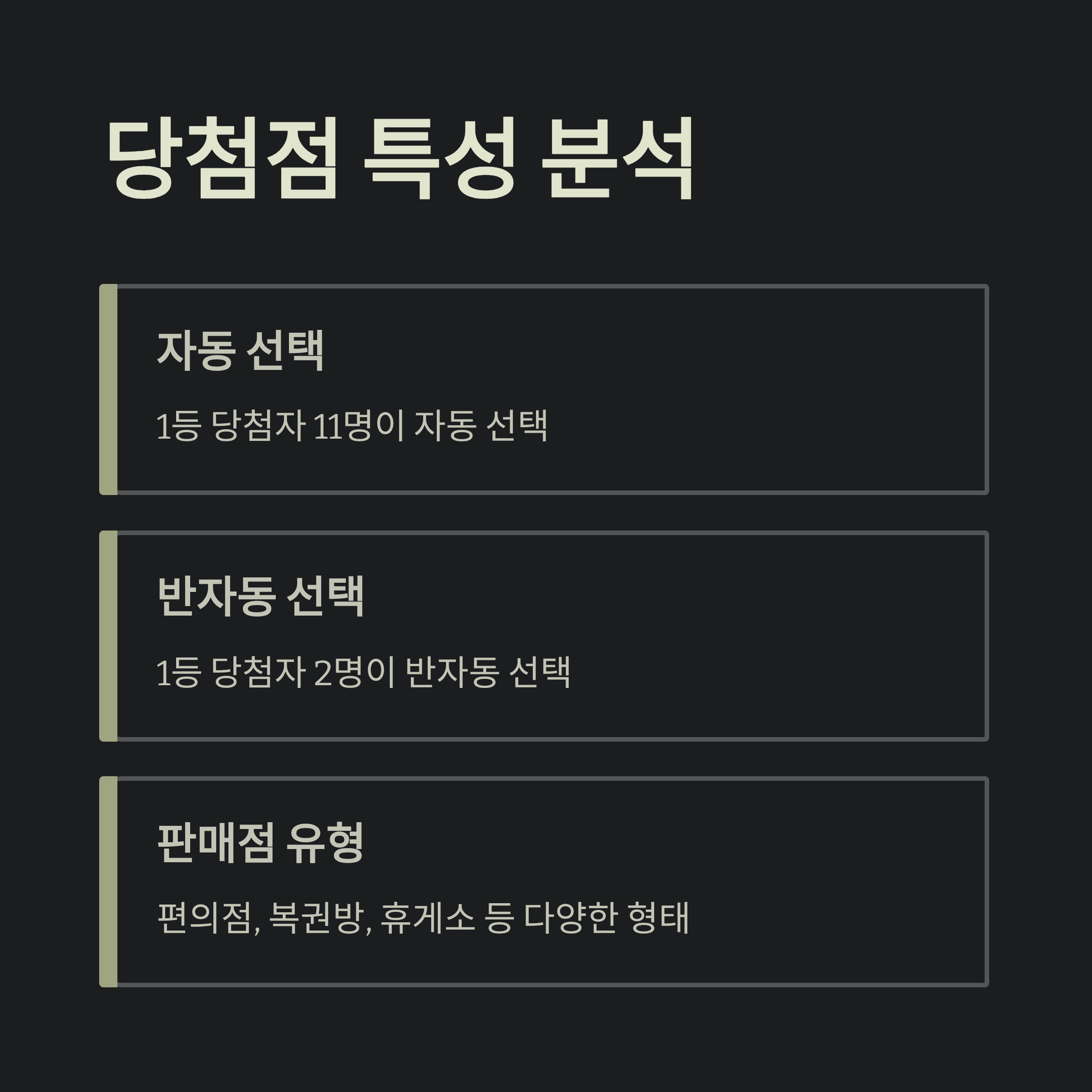 1등 당첨점의 경우 총 13곳에서 당첨자가 나왔는데, 모두 자동 11명, 반자동 2명으로 집계되었습니다. 수동 당첨자는 한 명도 없었다는 점이 특징적입니다.