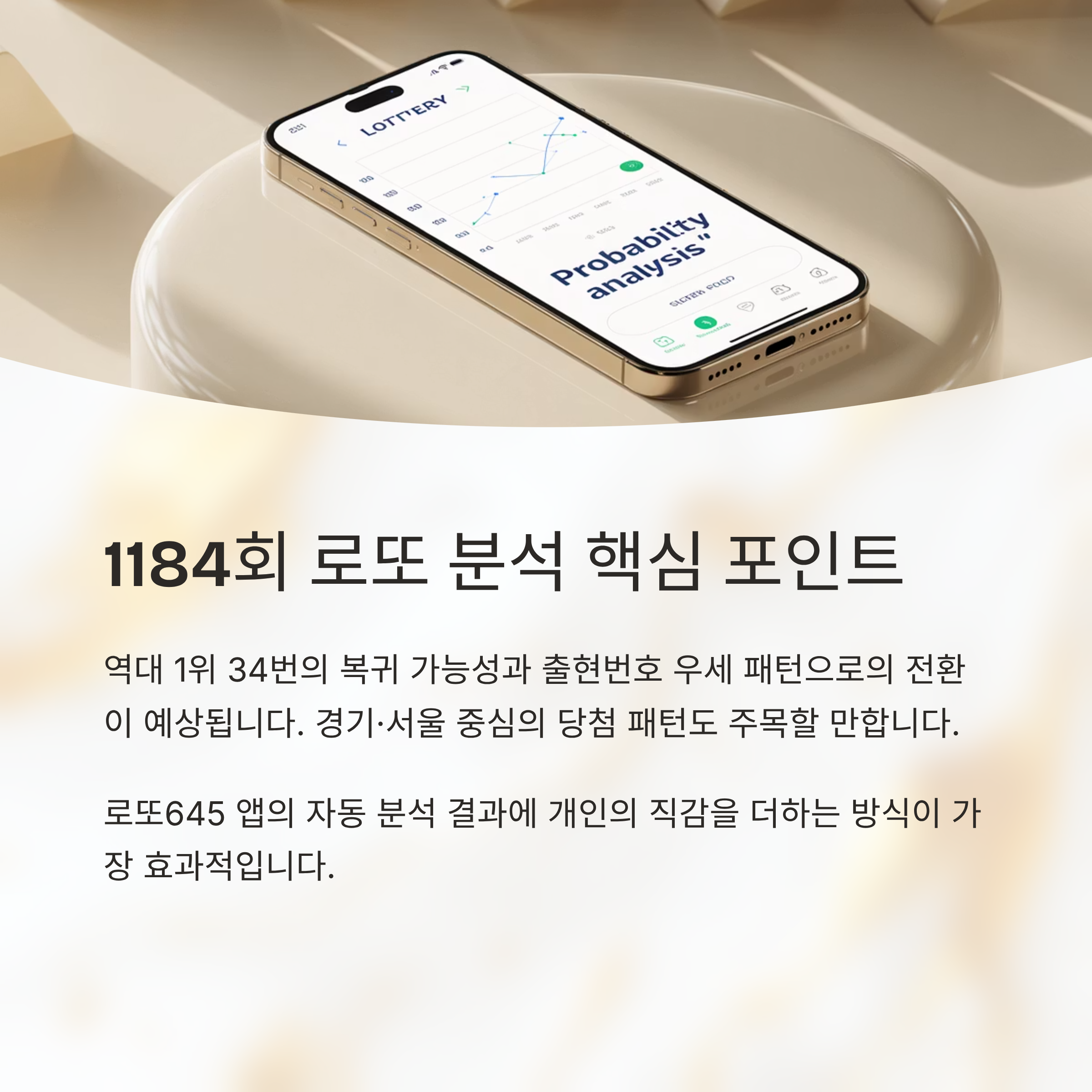 제가 개인적으로 로또645 앱을 활용해서 분석한 1184회 예상번호는 3, 13, 20, 34, 21, 45번입니다. 3번과 21번은 최근 강세, 13번과 20번은 8월 통계 상위, 34번은 역대 1위 복귀, 45번은 2호기 상위 번호라는 근거입니다.