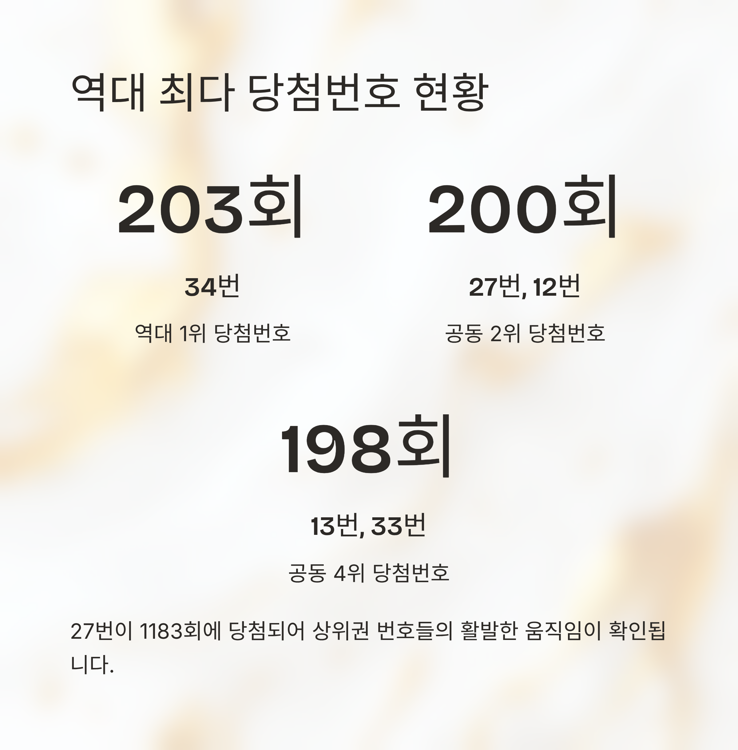 로또 최다 당첨번호 분석과 1184회 예상번호를 찾는 과정에서 가장 중요한 것은 역대 통계와 최근 당첨 패턴의 균형입니다. 1183회 당첨번호 4, 15, 17, 23, 27, 36번과 보너스 31번을 분석해보면, 5주간 미출현번호에서 4개가 나오면서 미출현번호 우세 패턴을 보였습니다. 이번 분석에서 주목할 점은 역대 최다 당첨번호 34번(203회)과 27번(200회)의 차이가 단 3회라는 것입니다. 27번이 1183회에 당첨되면서 200회를 기록했고, 34번과의 격차를 더욱 좁혔습니다.