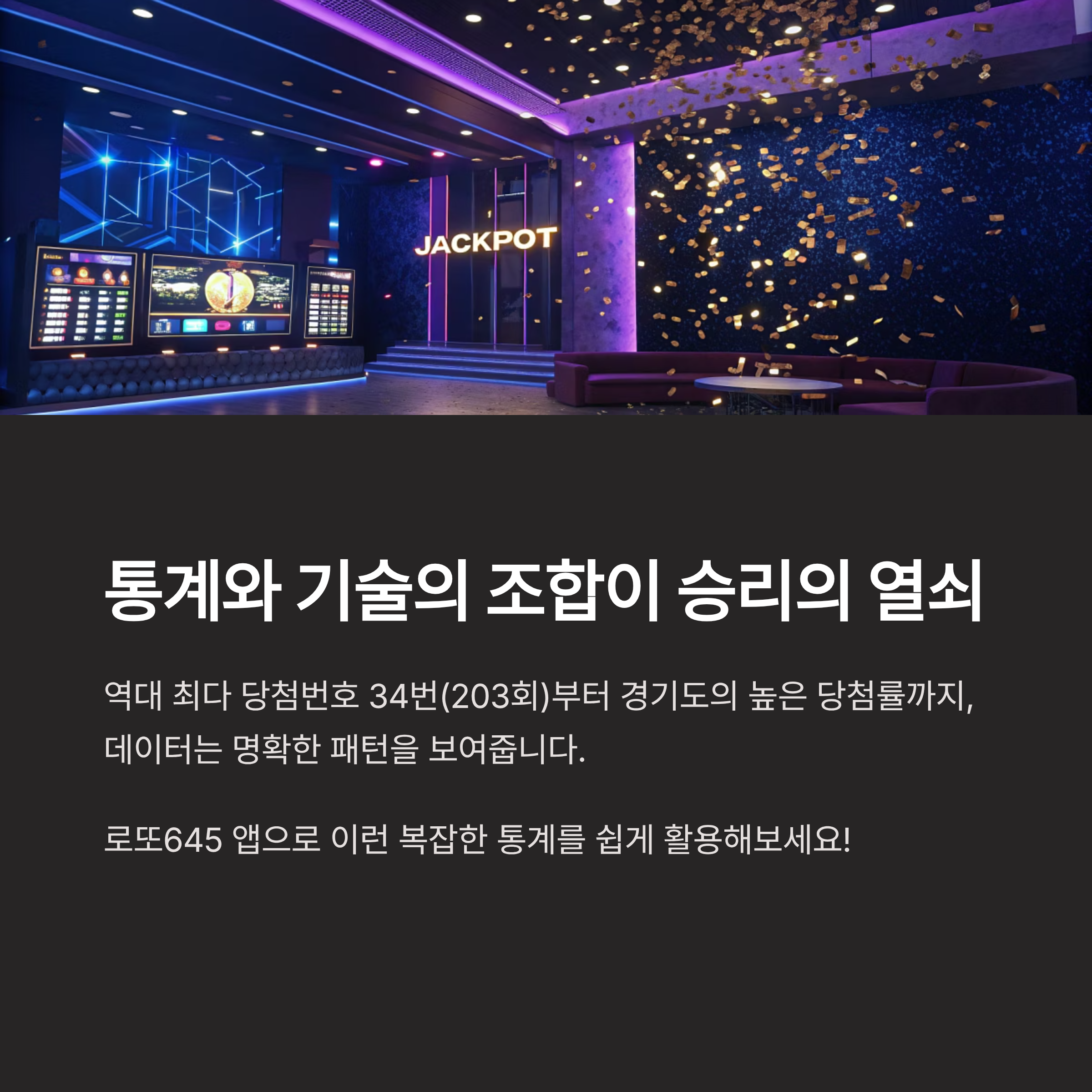 로또645 앱에서는 추첨기별 통계도 제공하므로, 현재 사용되는 2호기의 특성을 파악하여 예상번호 선정에 활용할 수 있습니다.