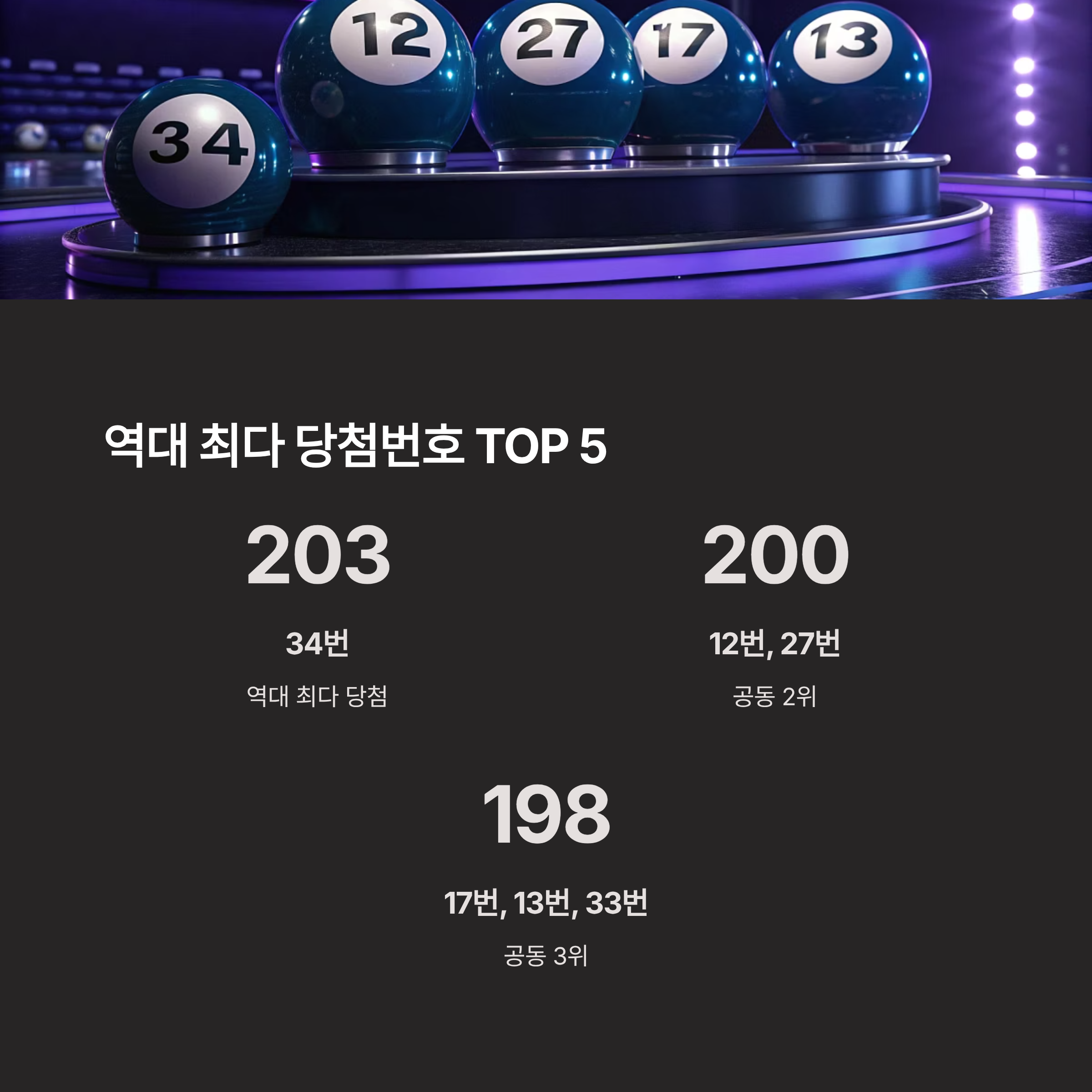 이어서 12번과 27번이 각각 200회, 17번과 13번, 33번이 198회를 기록했습니다. 상위 10위권 내 번호들의 당첨횟수는 모두 190회를 넘어섭니다.