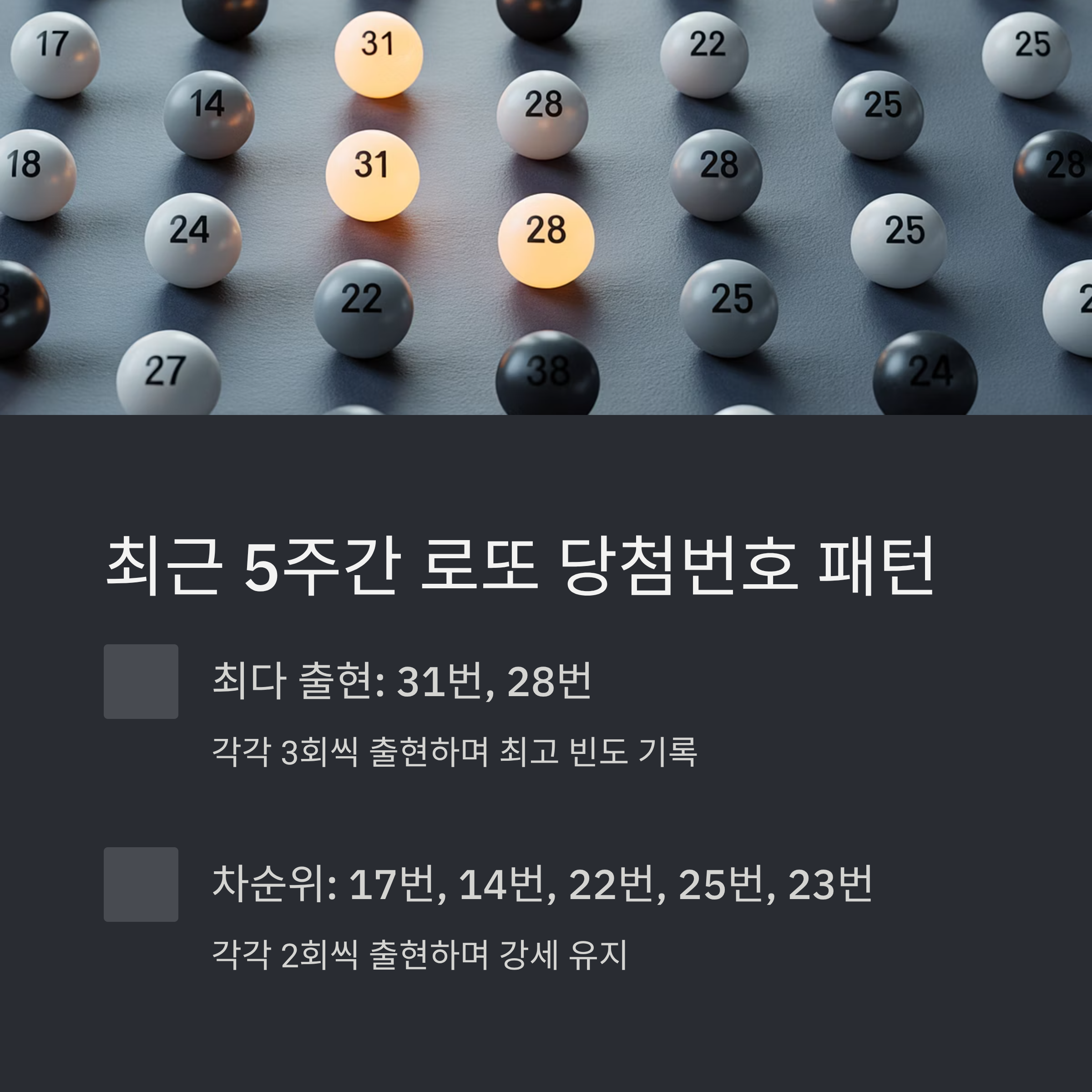 최근 5주간 데이터는 현재 가장 활발한 번호 트렌드를 보여주는 핵심 지표입니다. 5주간 당첨횟수 분석에서 31번과 28번이 각각 3회씩 출현하며 최고 빈도를 기록했습니다.