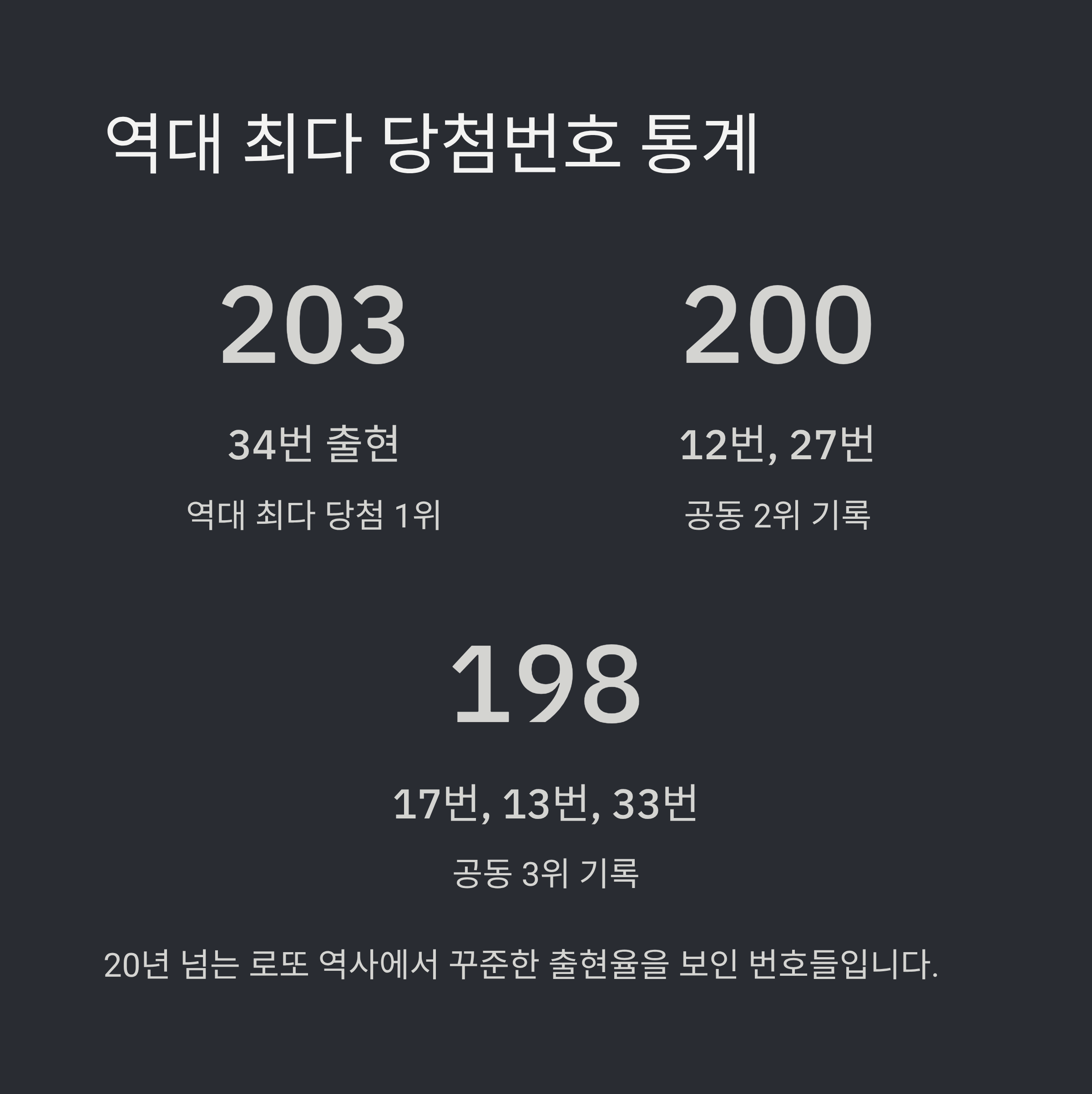 상위 15개 번호의 당첨횟수를 살펴보면 34번(203회), 12번(200회), 27번(200회), 17번(198회), 13번(198회), 33번(198회) 순으로 나타납니다. 이들 번호는 20년 넘는 로또 역사에서 꾸준한 출현율을 보여왔습니다.