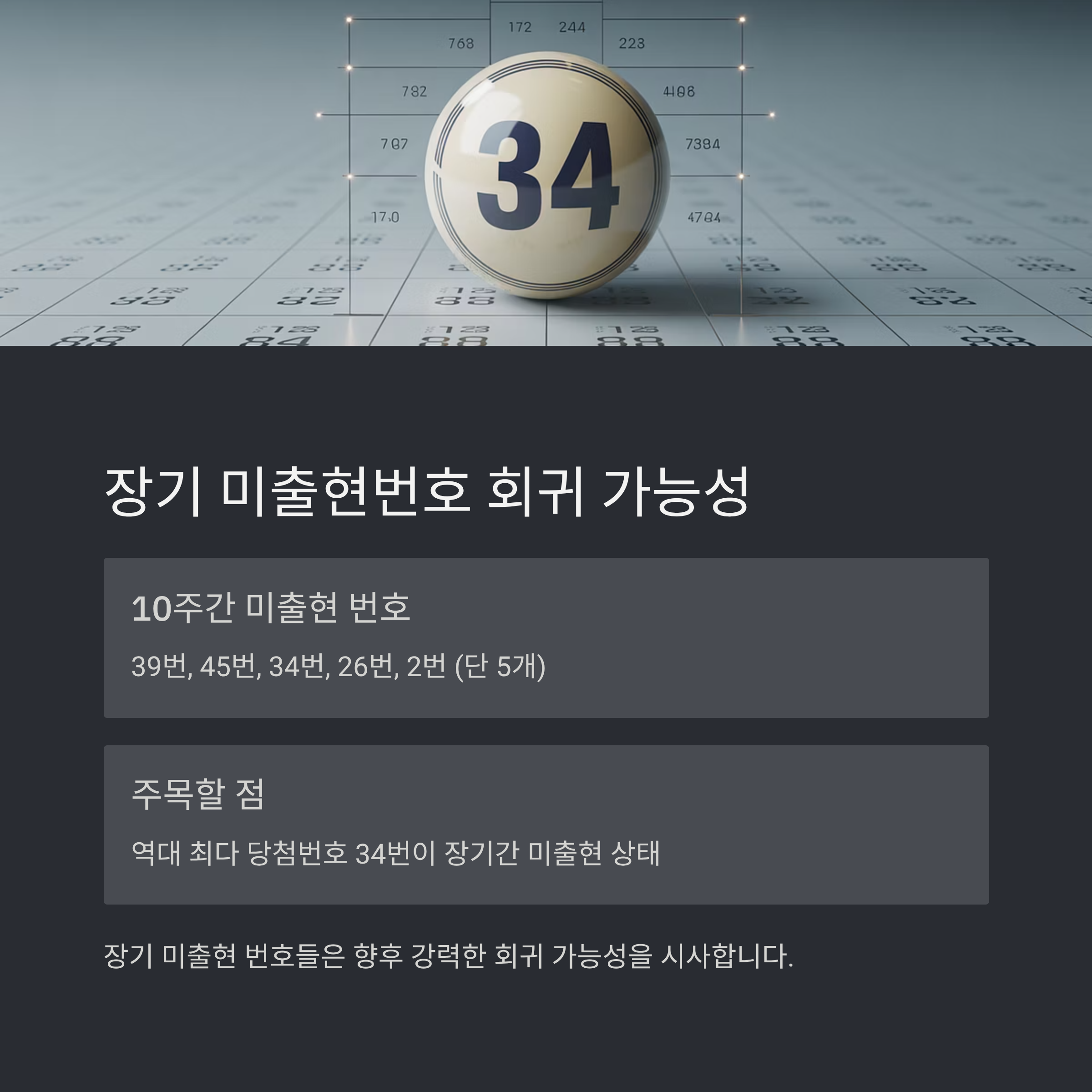 10주간 미출현번호는 단 5개로 대폭 줄어들었습니다. 39번, 45번, 34번, 26번, 2번이 해당되며, 이 중 34번은 역대 최다 당첨번호임에도 장기간 미출현 상태입니다.