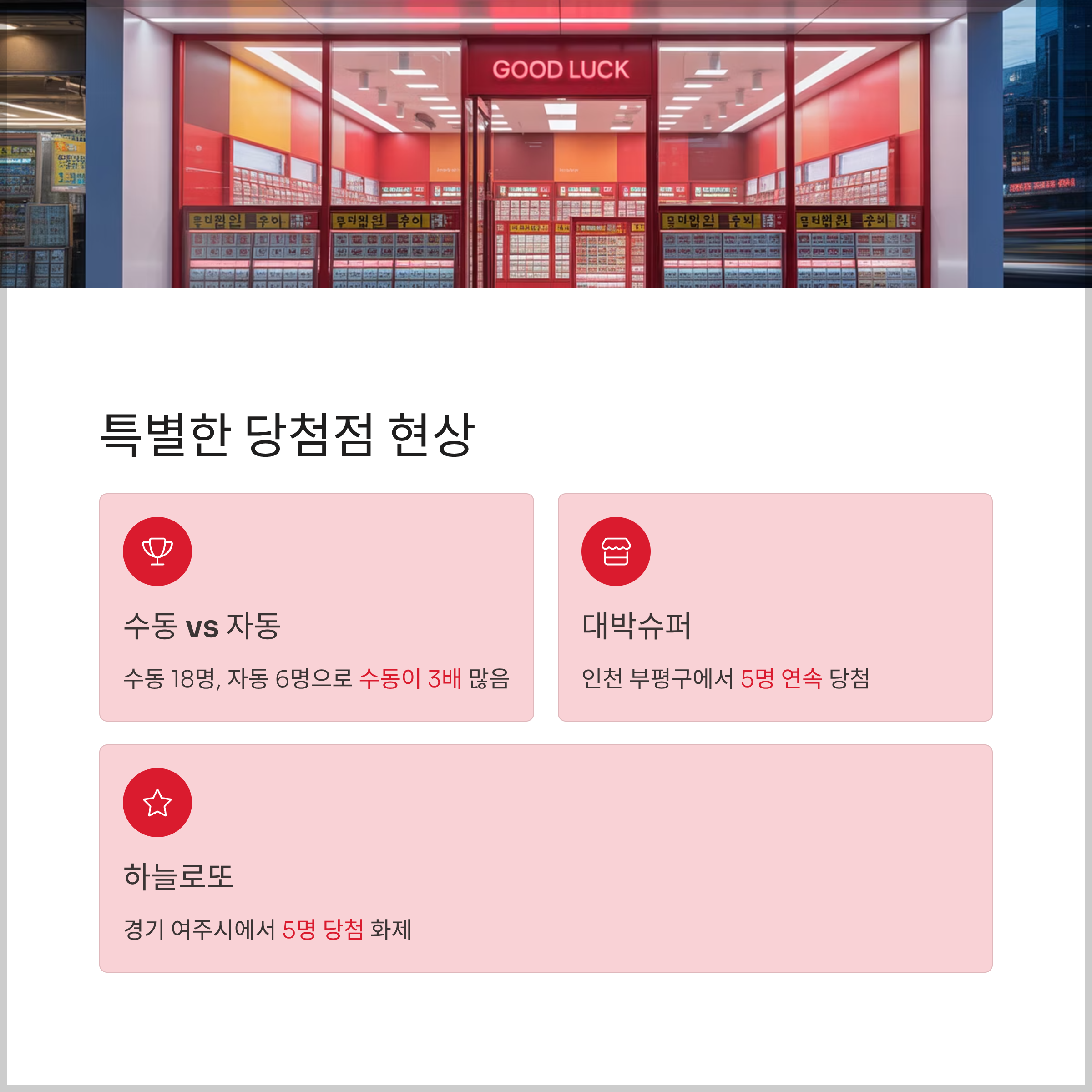 이는 최근 수동 선택으로 당첨되는 사례가 늘고 있음을 보여주는 데이터입니다. 특히 인천 부평구의 '대박슈퍼'에서 5명이 연속으로 당첨되는 이례적인 현상도 있었죠.