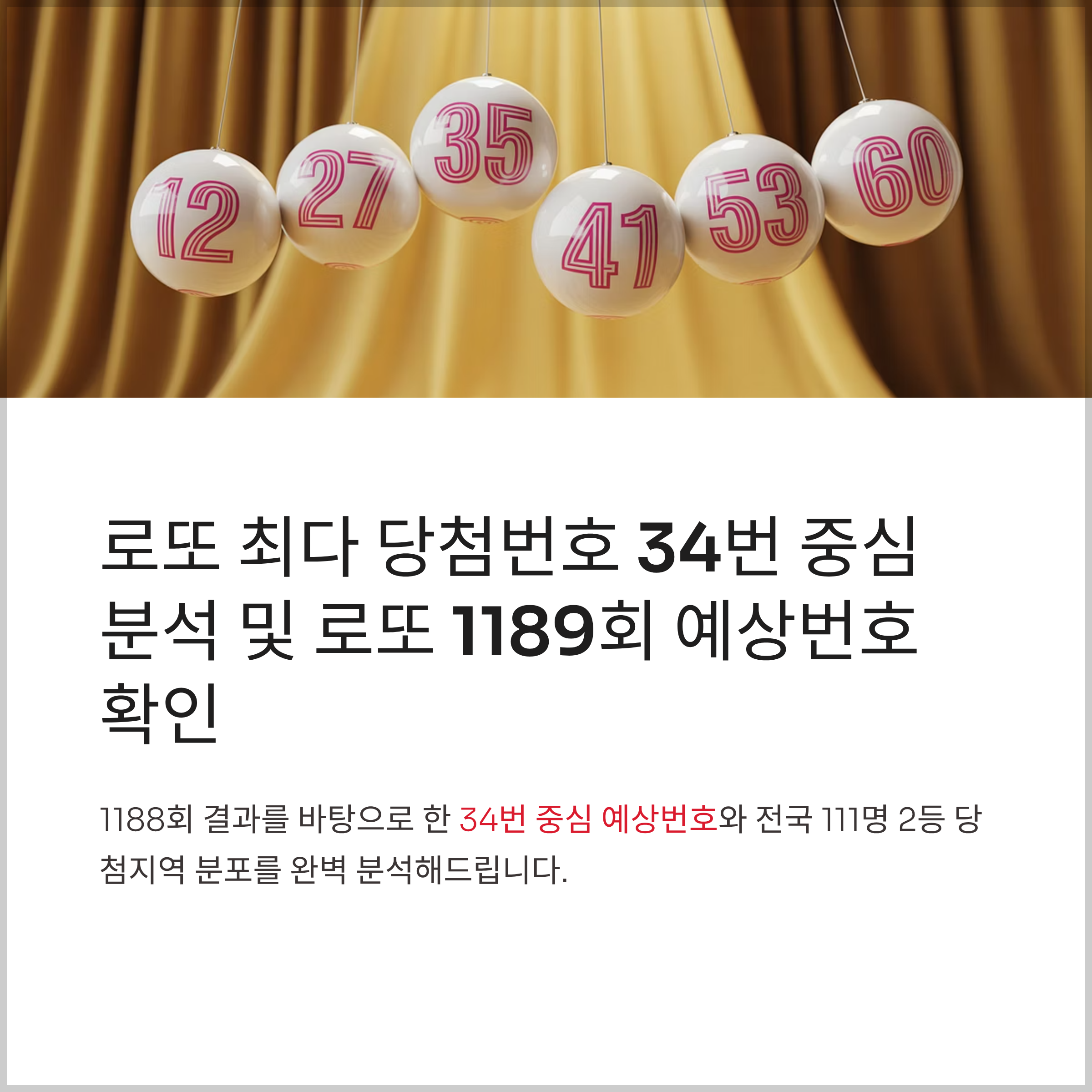 매주 토요일이면 수많은 사람들이 기다리는 로또 추첨 결과가 발표됩니다. 특히 1188회 로또에서는 1등 당첨자가 24명이 나왔고, 2등 당첨자는 111명이라는 높은 수치를 기록했습니다. 이런 결과를 보면서 많은 분들이 궁금해하시는 것이 바로 다음 회차인 1189회의 예상번호일 것입니다.