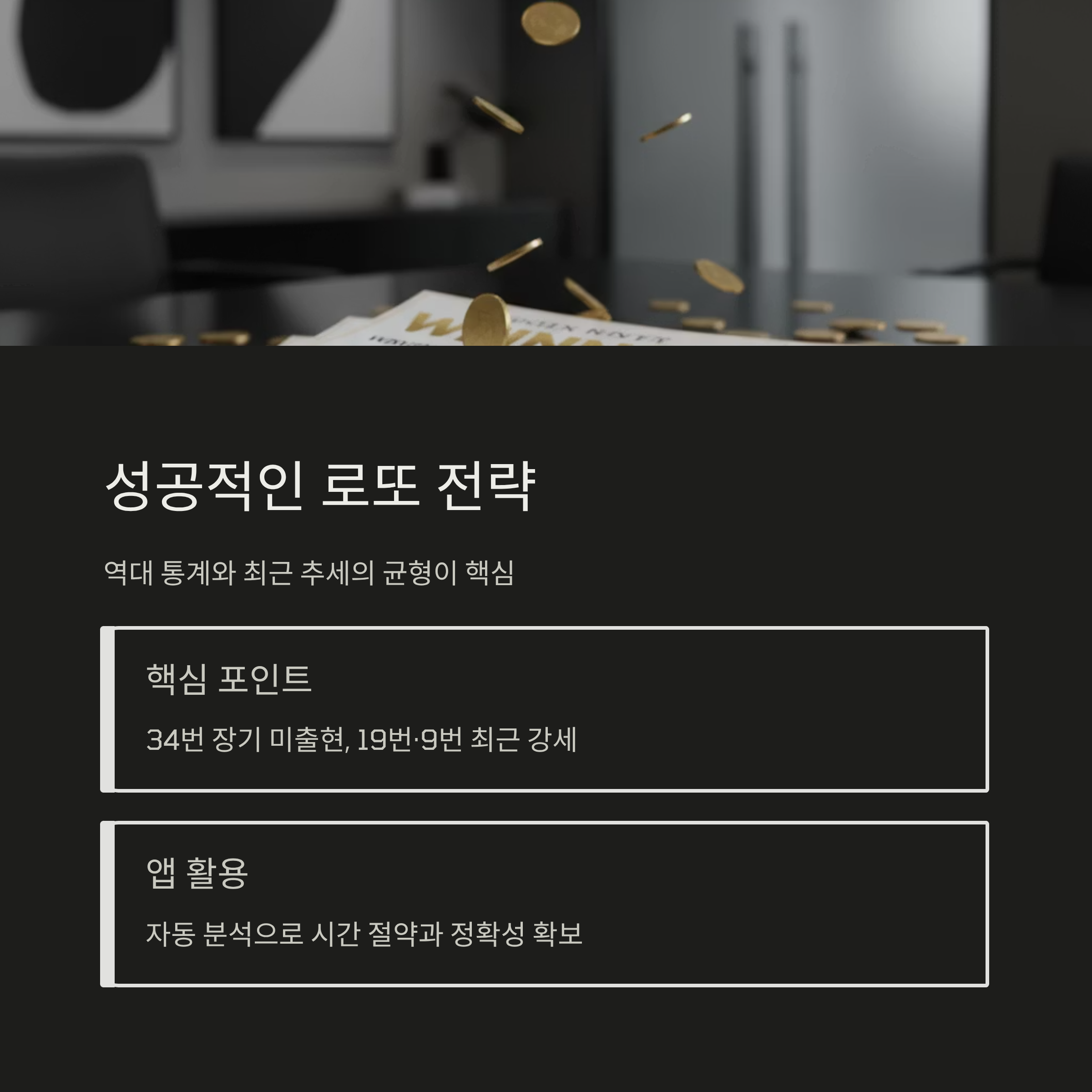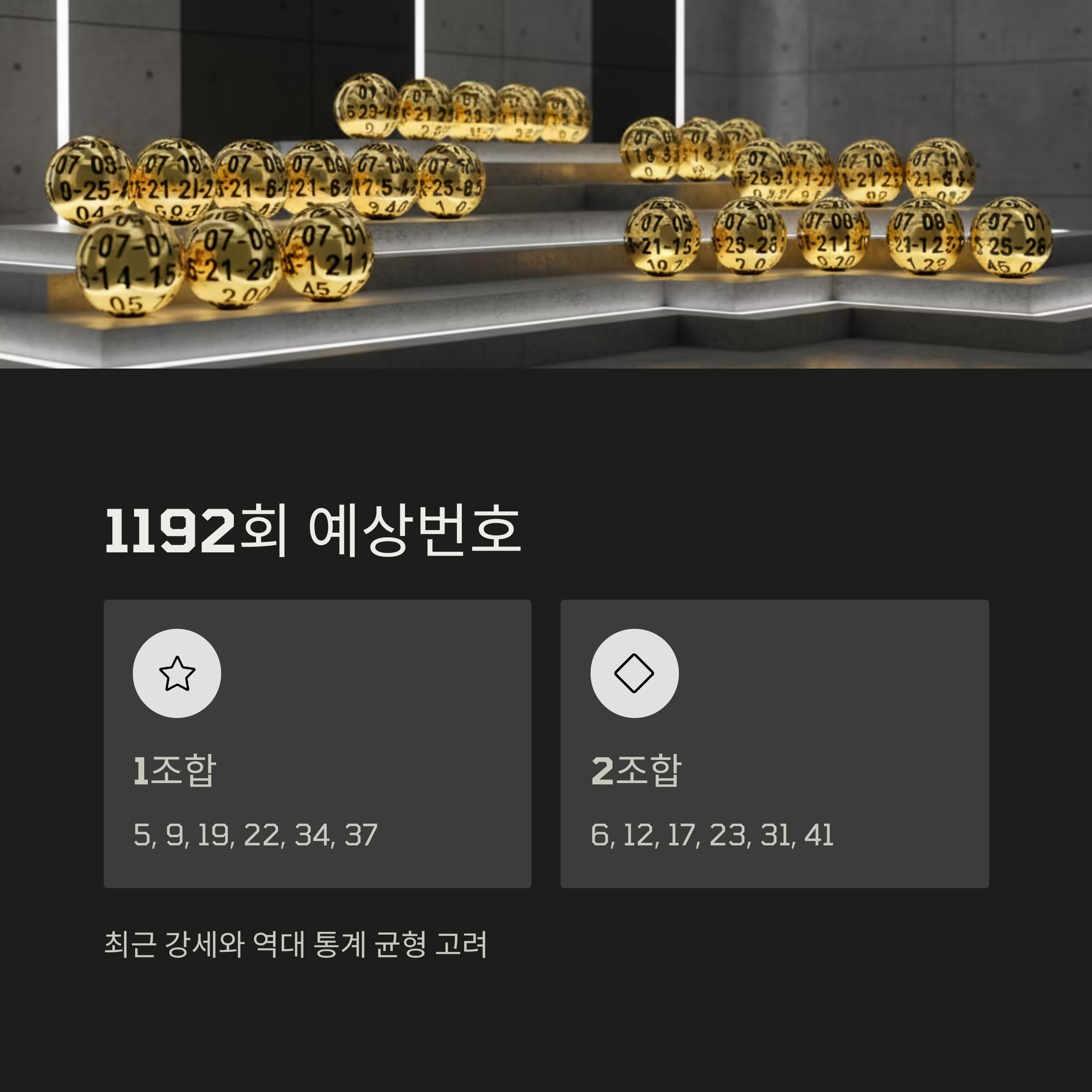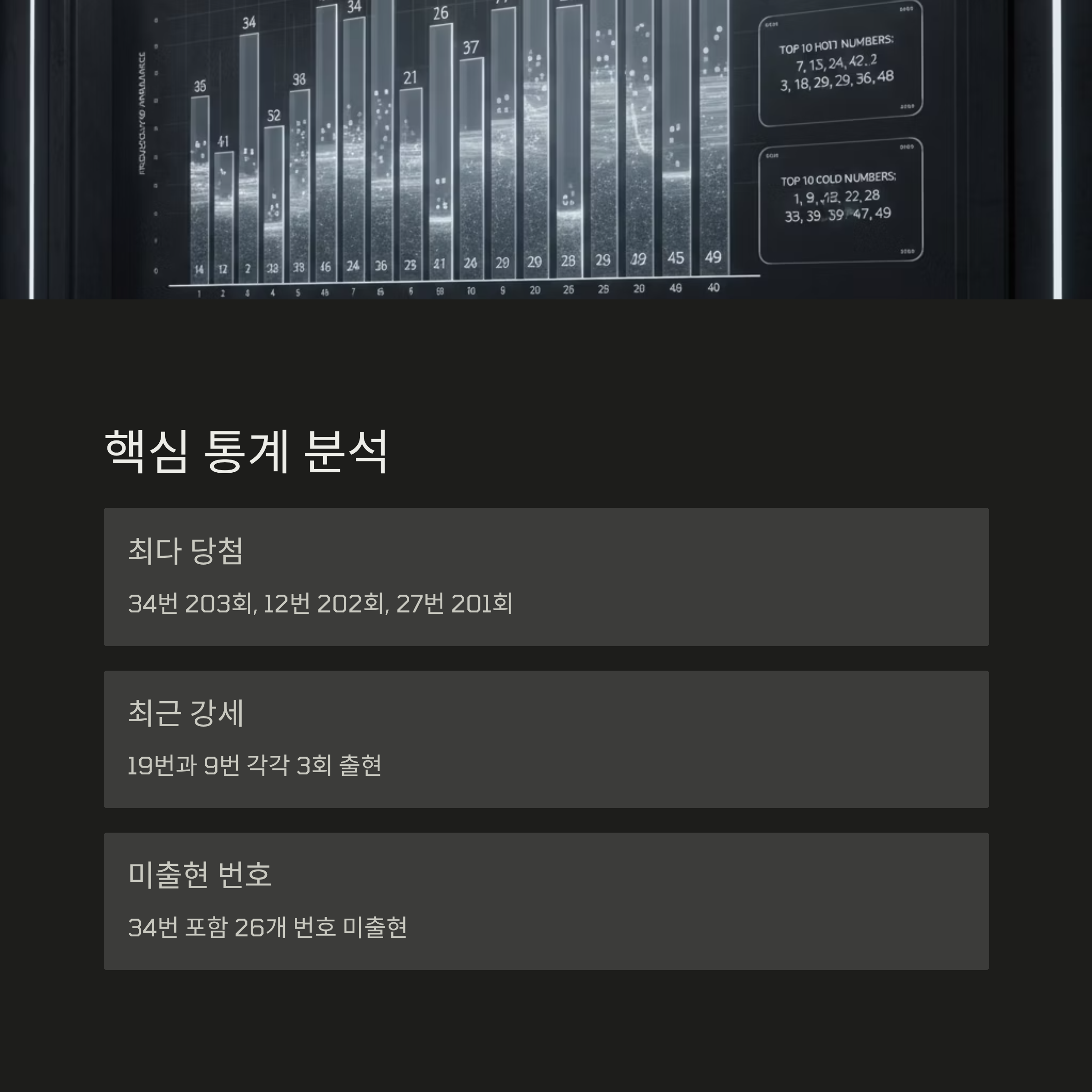 무엇보다 매주 업데이트되는 최신 통계를 바탕으로 예상번호를 생성하므로, 개인이 수작업으로 분석하는 것보다 훨씬 정확하고 효율적입니다. 앞으로도 꾸준히 통계 분석과 앱 활용을 병행하면서 나만의 번호 선택 전략을 만들어가시기 바랍니다.