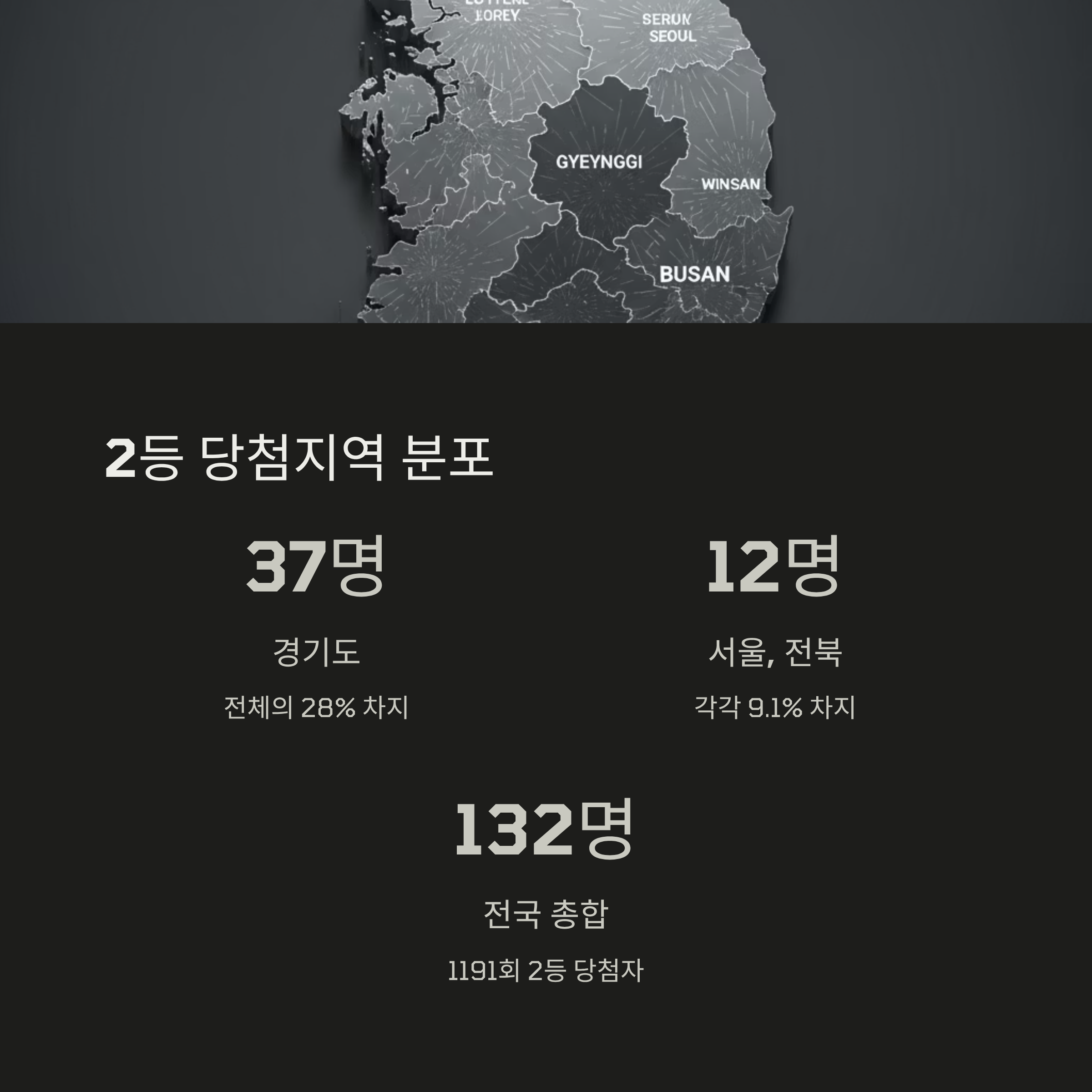 1191회 2등 당첨자 132명의 지역별 분포를 보면 경기도가 37명으로 28%를 차지했고, 서울과 전북이 각각 12명으로 9.1%, 충남과 강원이 각각 10명으로 7.6%를 기록했습니다.