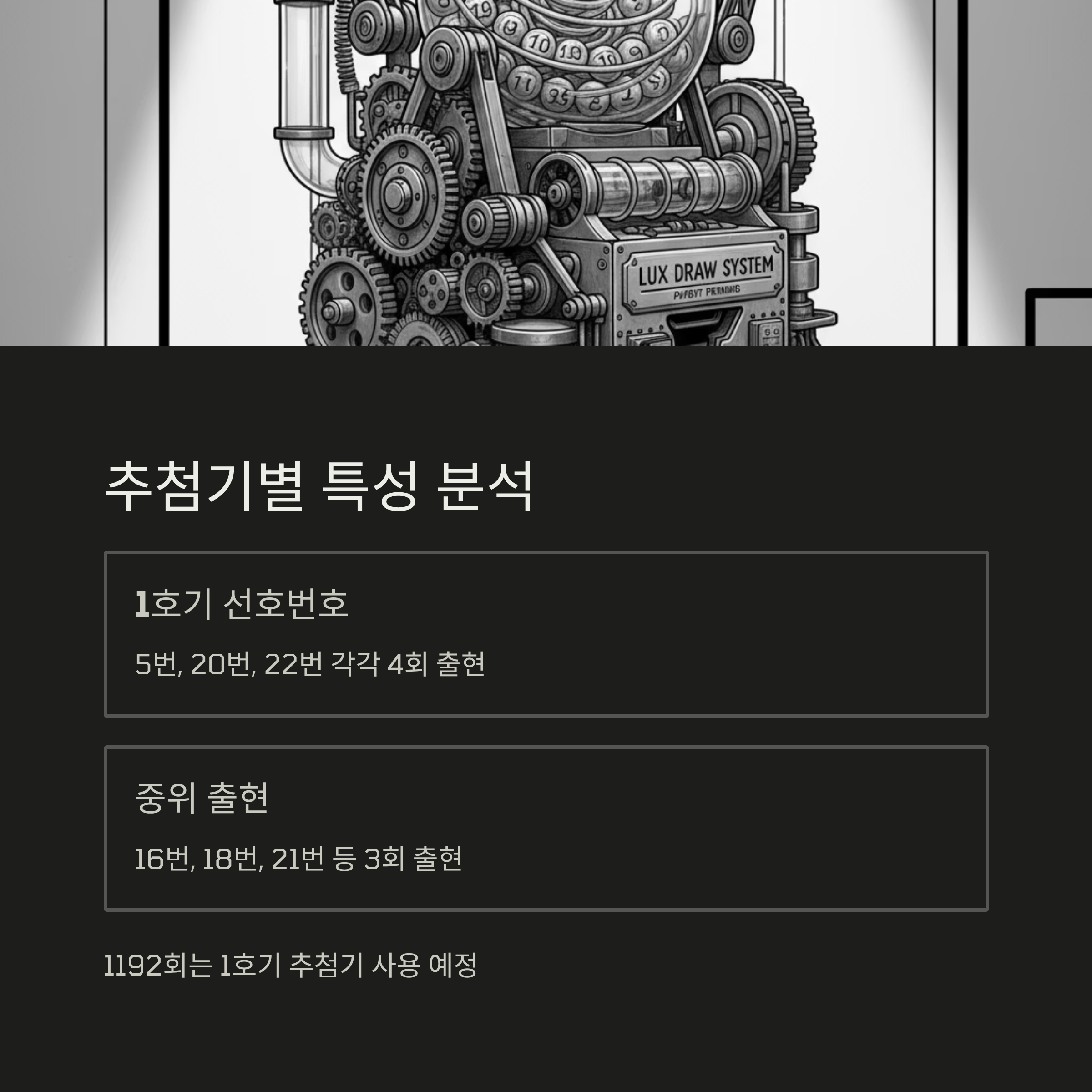 이번 주 1192회 로또 예상번호를 찾는 과정에서 역대 최다 당첨번호 34번이 10주간 미출현 상태라는 점과 최근 5주간 19번, 9번이 강세를 보인다는 점이 중요한 단서가 되었습니다. 또한 1호기 추첨기의 특성상 5번, 20번, 22번이 자주 출현한다는 통계도 참고할 만합니다.