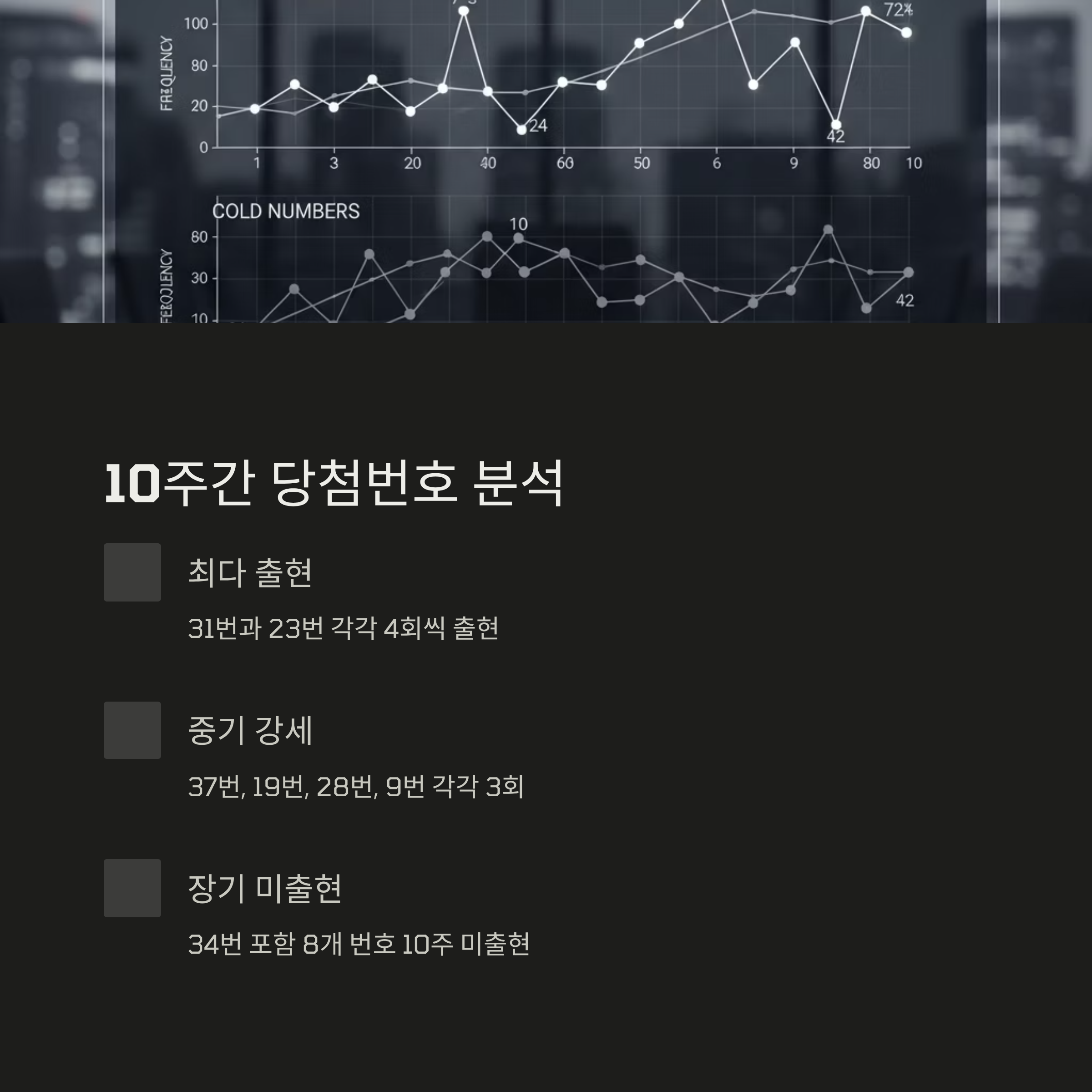 최근 10주간 통계에서는 31번과 23번이 각각 4회씩 출현하여 최다를 기록했고, 37번, 19번, 28번, 9번, 4번, 29번, 22번, 13번이 각각 3회씩 나왔습니다.