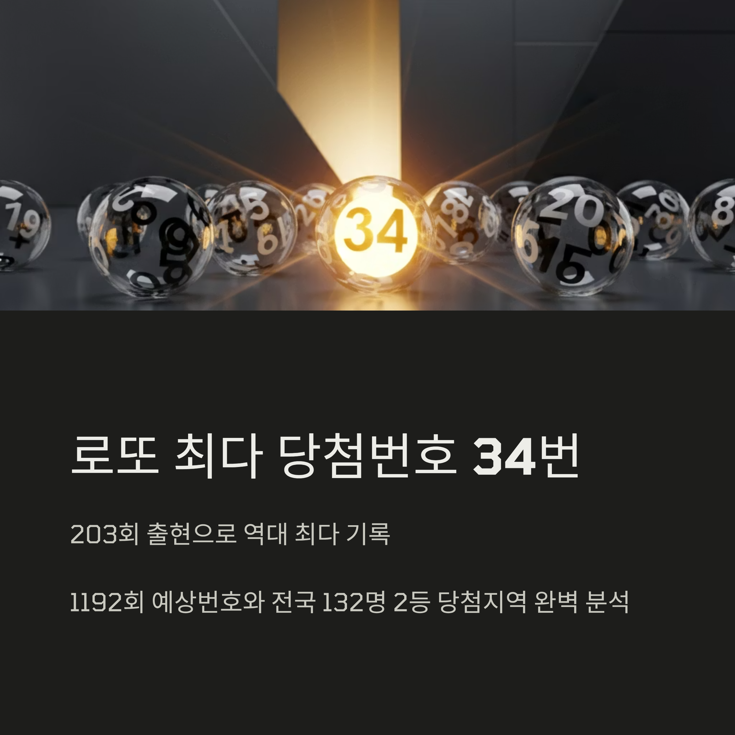 역대 1191회까지의 통계를 분석해보면 34번이 203회로 가장 많이 당첨되었고, 12번 202회, 27번 201회, 13번 200회, 33번 199회 순으로 나타났습니다.