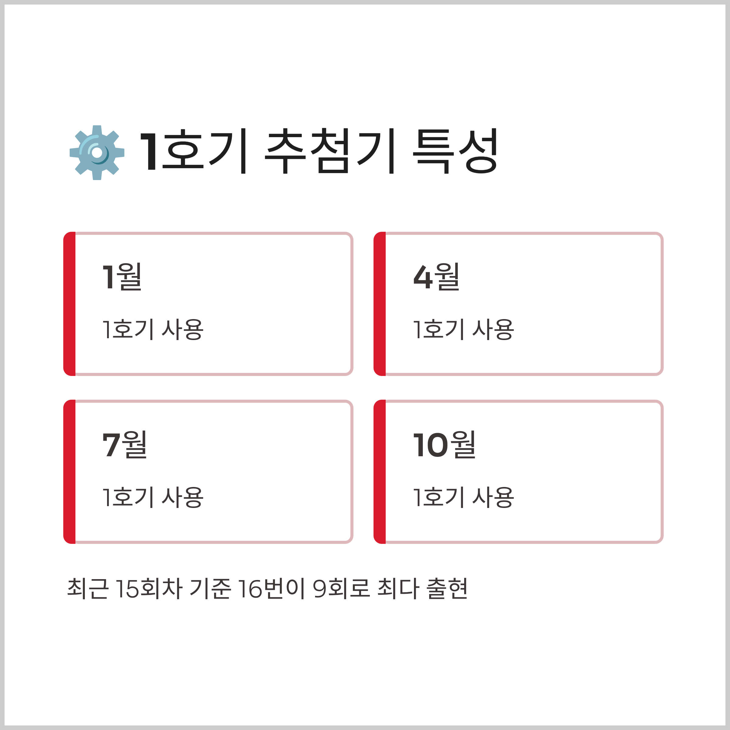 1호기 추첨기는 10월에 사용되며, 1월, 4월, 7월, 10월에 순환적으로 나타납니다. 1호기의 특성을 보면 특정 번호들이 다른 추첨기보다 더 자주 나오는 경향이 있습니다. 최근 15회차 기준으로 16번이 9회로 가장 많이 나왔습니다.