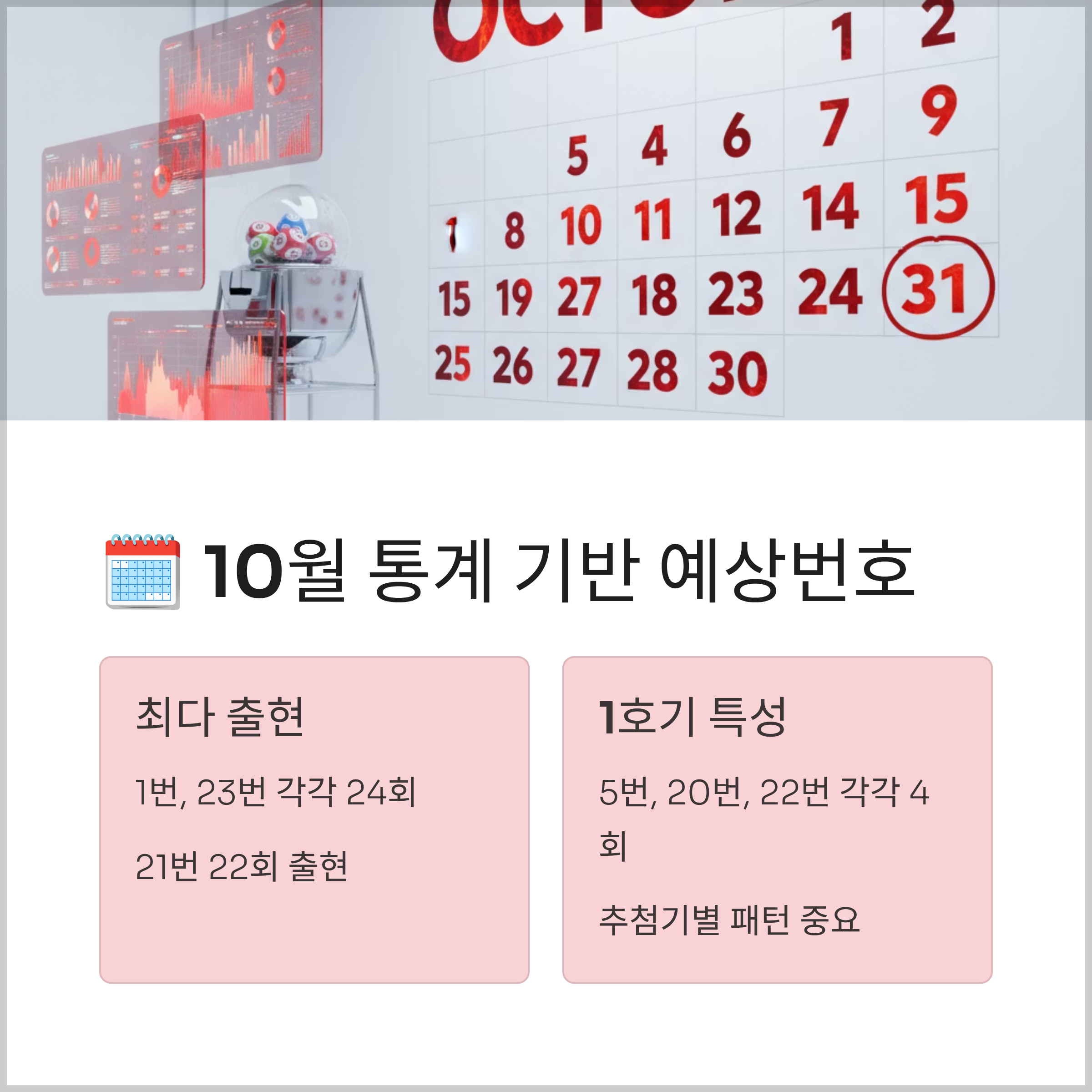10월은 1호기 추첨기가 사용되는 달입니다. 역대 10월 통계를 보면 1번과 23번이 각각 24회로 가장 많이 나왔고, 21번이 22회, 37번과 31번, 35번이 각각 20회 출현했습니다.