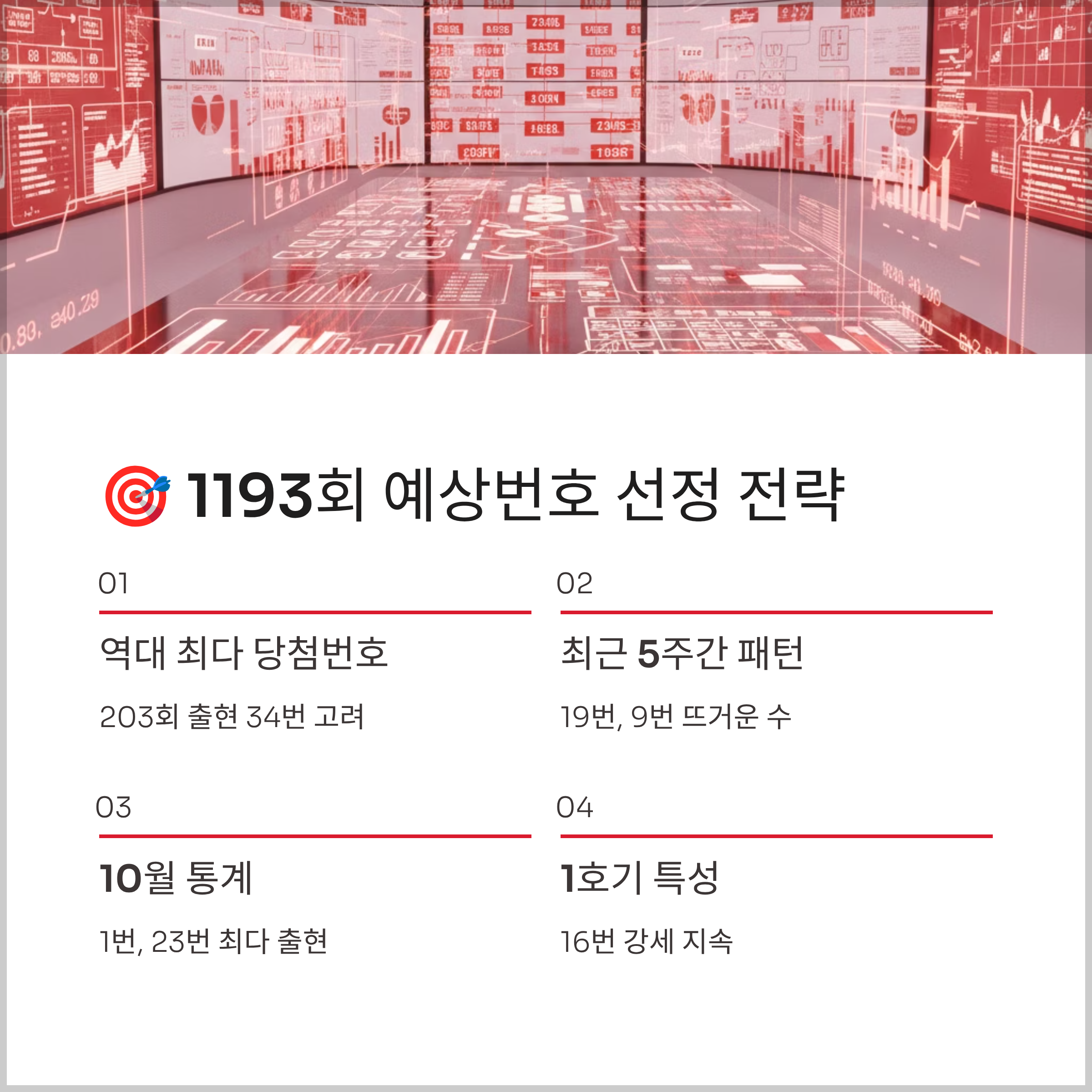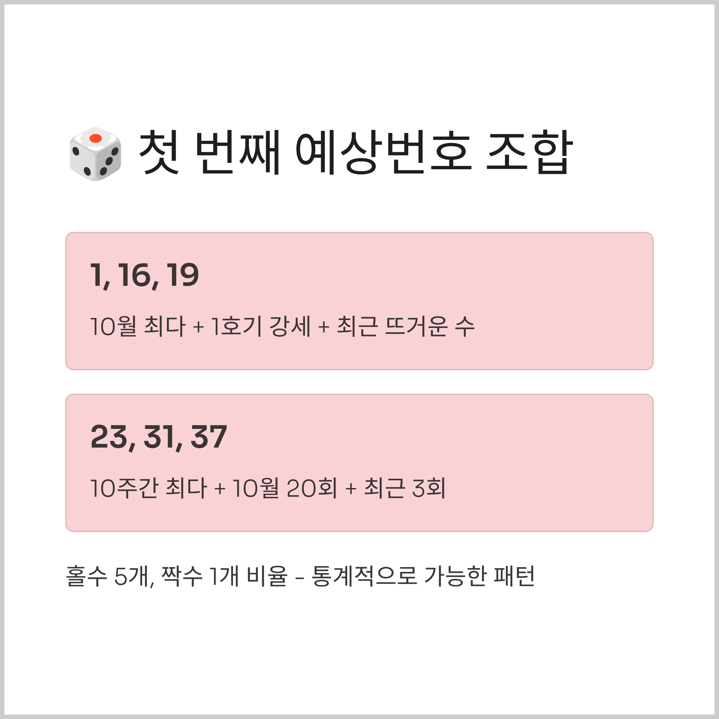 1번은 10월 통계에서 24회로 최다 출현 번호이고, 16번은 1호기 추첨기에서 최근 15회차에 9회 나온 번호입니다. 19번은 최근 5주간 3회 출현한 뜨거운 수이고, 23번은 최근 10주간 5회 나온 번호입니다.
