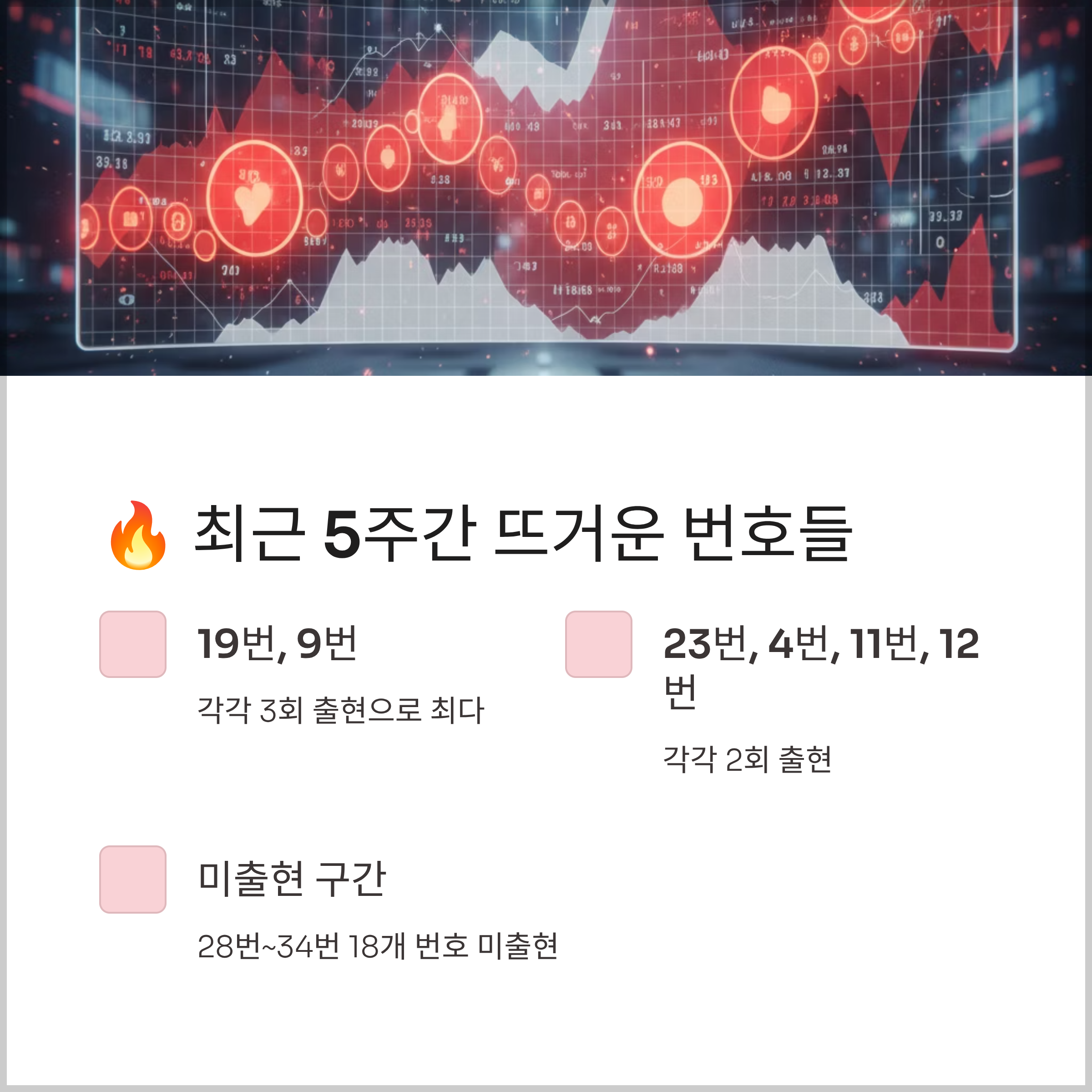 역대 최다 당첨번호인 34번이 최근 15주간 미출현 상태라는 점, 19번과 9번이 최근 5주간 3회씩 나온 뜨거운 수라는 점, 23번이 최근 10주간 5회 출현했다는 점이 주요 분석 포인트였습니다.