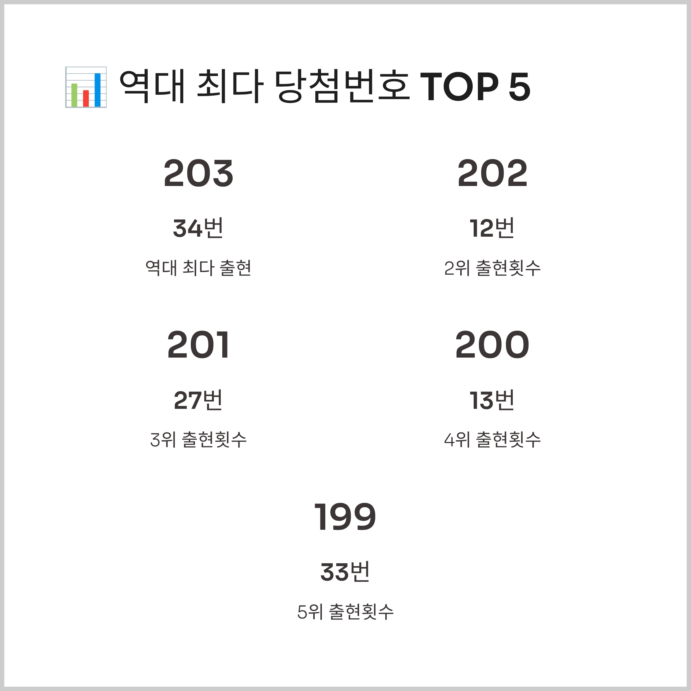 그 뒤를 이어 12번 202회, 27번 201회, 13번 200회, 33번 199회 순으로 출현했습니다. 이들 상위 15개 번호는 모두 190회 이상 당첨된 기록을 보유하고 있습니다.