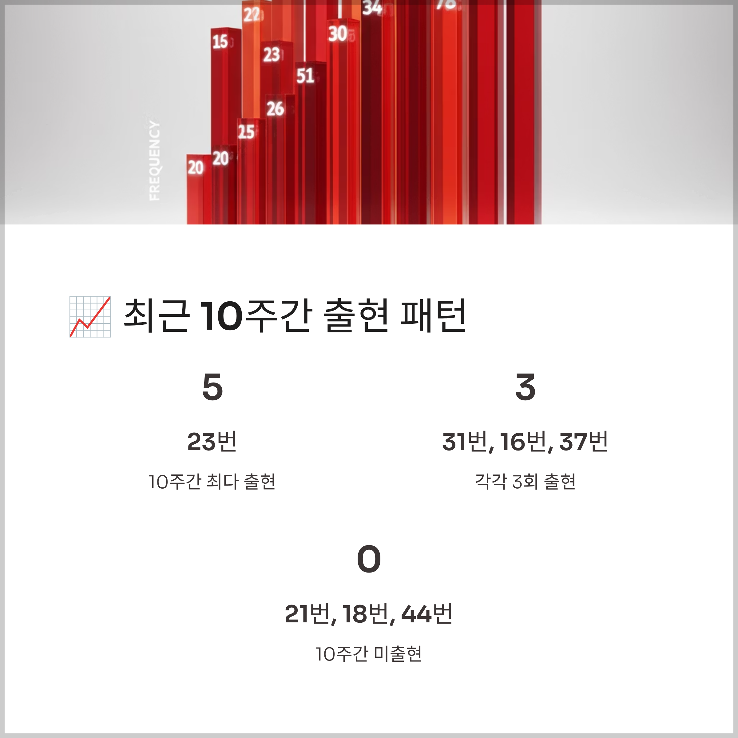 23번, 4번, 11번, 12번이 2회 출현했고, 31번, 16번, 37번 등 21개 번호가 1회씩 나왔습니다. 28번부터 34번까지 18개 번호는 최근 5주간 한 번도 나오지 않았습니다.