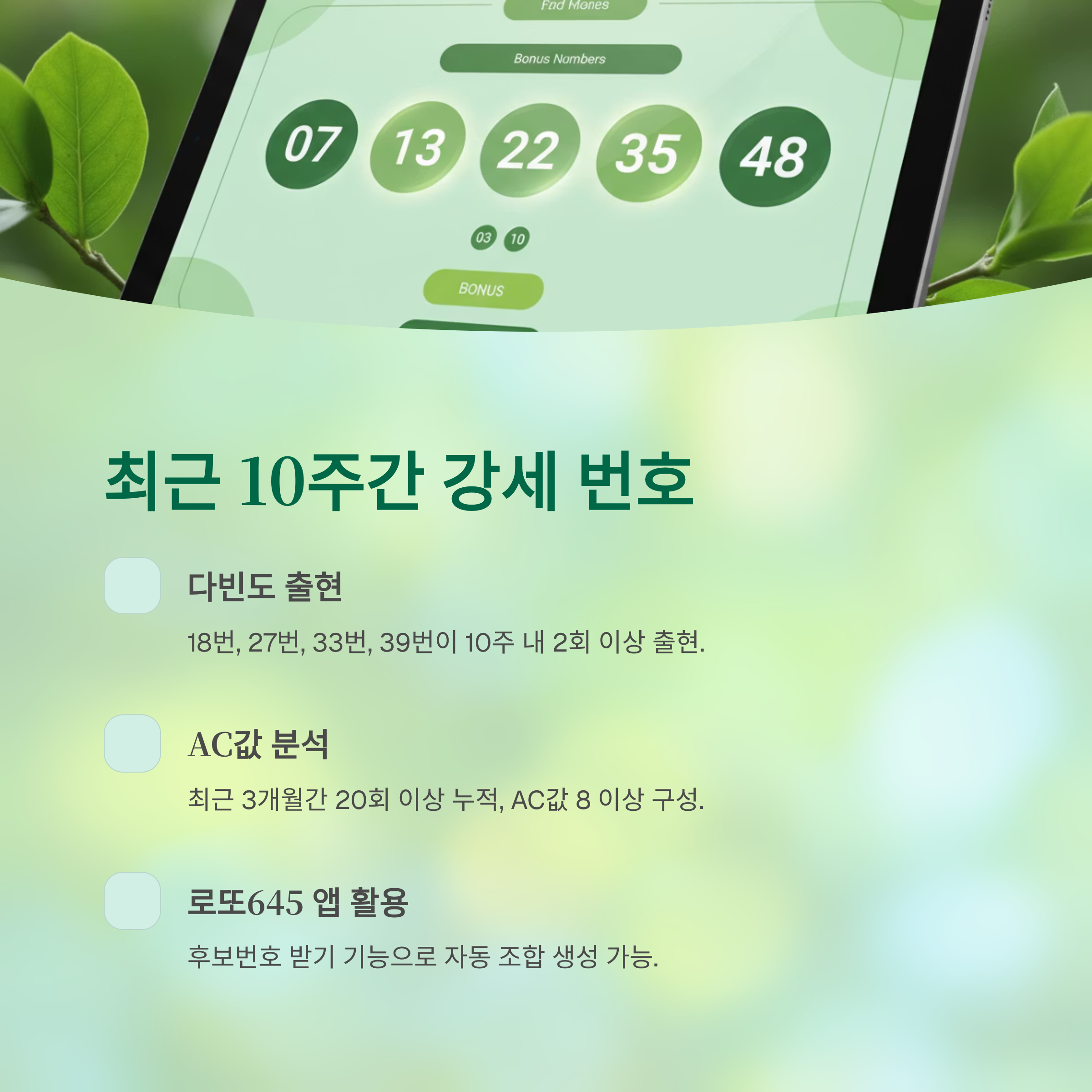 로또645 앱의 “상세 조합 생성” 기능에서 ‘후보번호 받기’를 실행하면 최근 5주간 출현비율을 반영한 자동 추천번호가 생성됩니다. 앱이 제시한 후보번호군(7, 18, 20, 33, 39, 42)을 바탕으로 산술 복합도(AC값 7~8 범위) 분석을 병행했습니다.