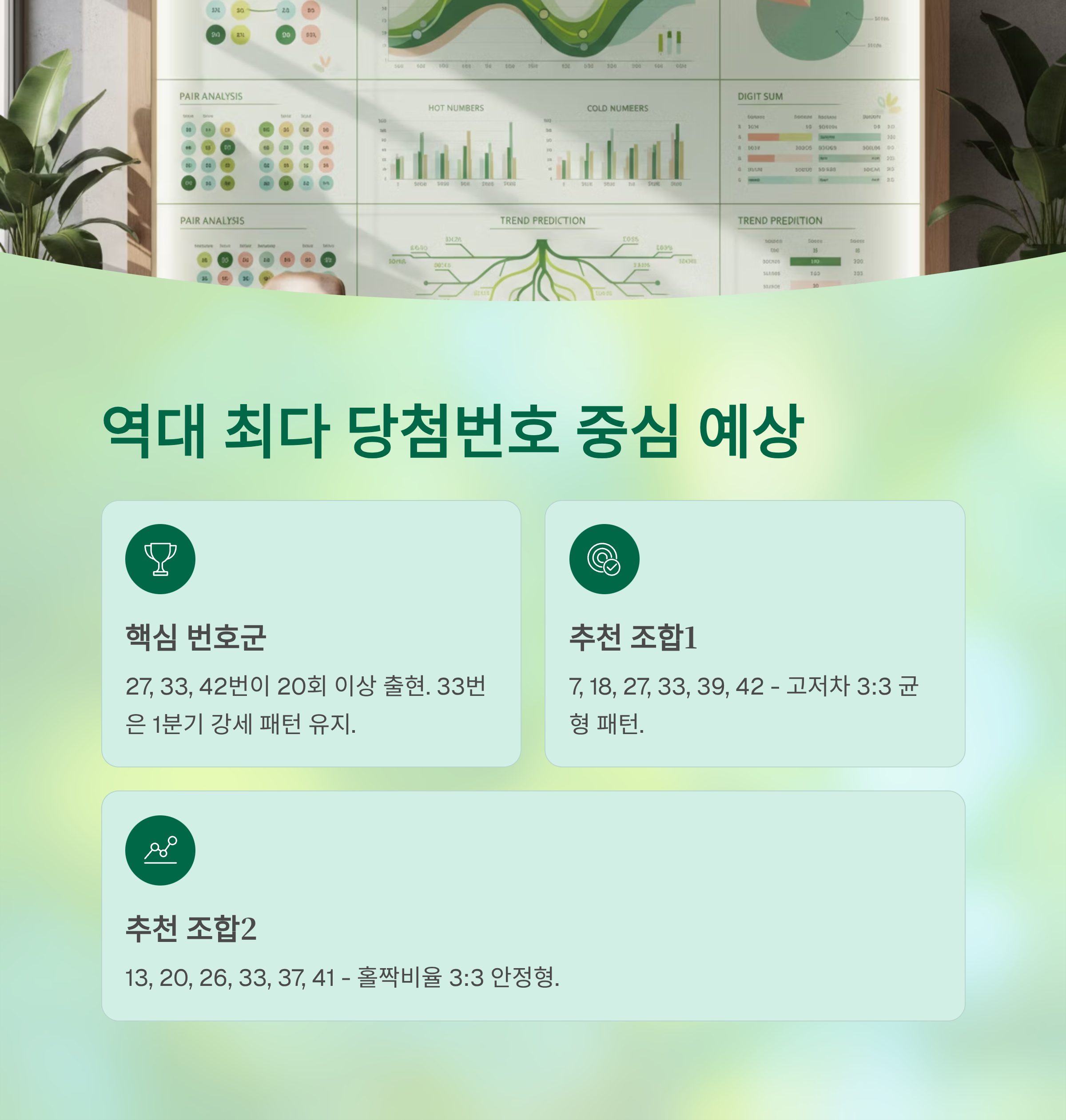 핵심 조합은 7, 18, 27, 33, 39, 42이며, 이는 고저차·홀짝·단위패턴이 균형을 이루는 형태입니다.