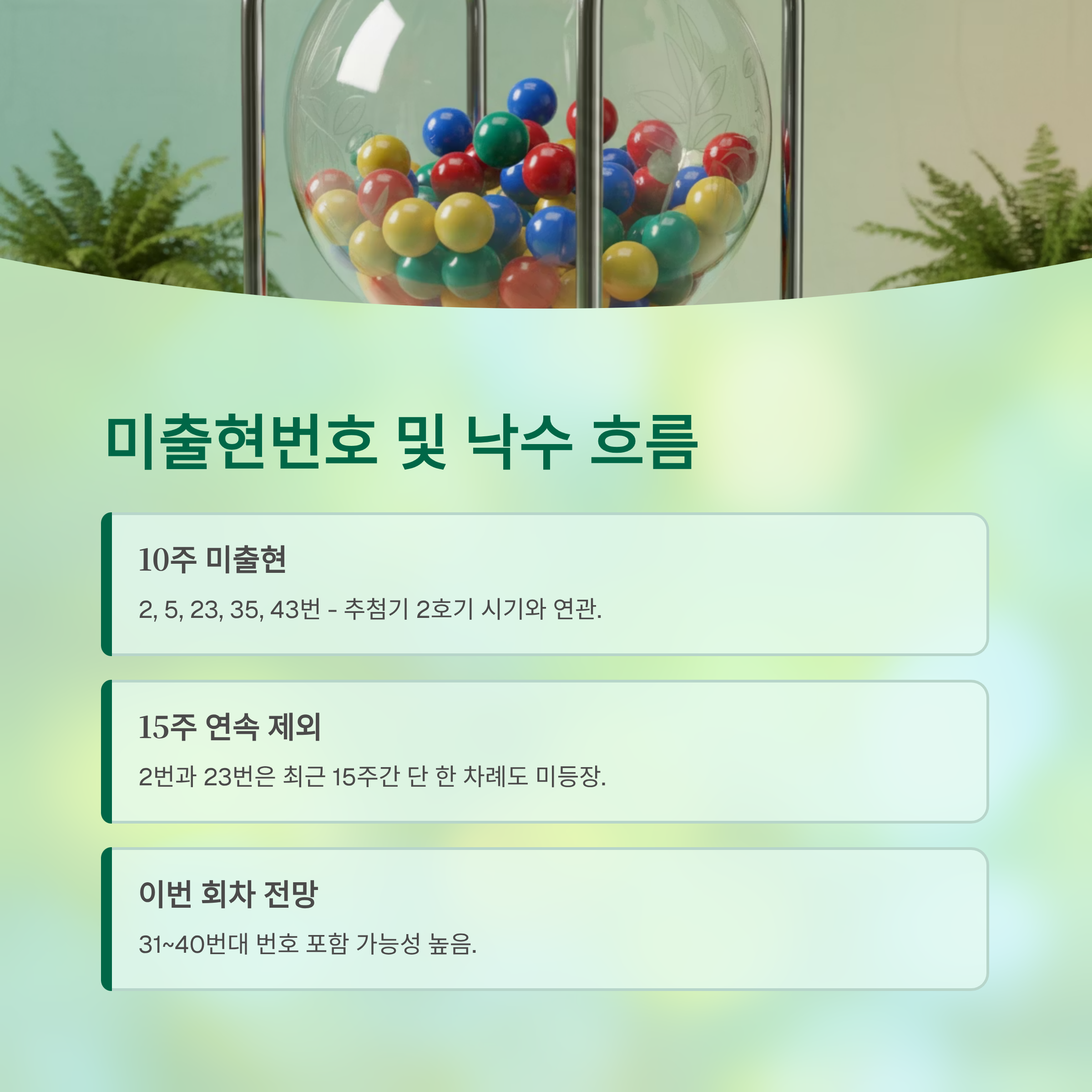 특히 2번과 23번은 최근 15주간 단 한 차례도 등장하지 않았으며, 이는 추첨기 2호기 시기와 겹칩니다. 낙수 흐름상 이번 회차에서는 31~40번대 번호가 다시 포함될 가능성이 높습니다.