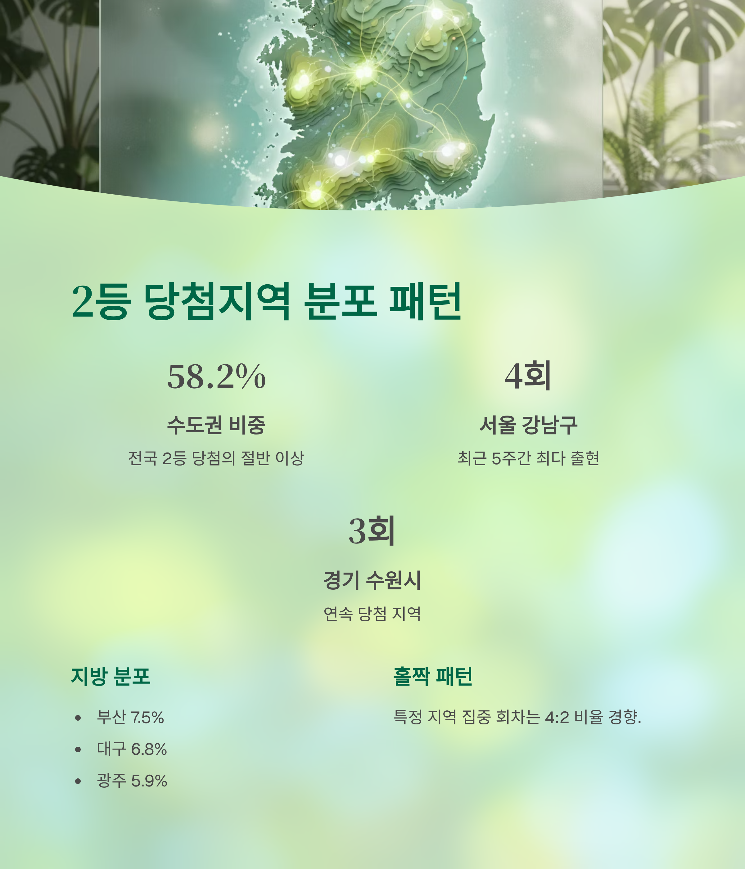 최근 5주간 2등 당첨지역을 보면, 서울 강남구와 경기 수원시가 각각 4회, 3회씩 연속 출현했습니다.
