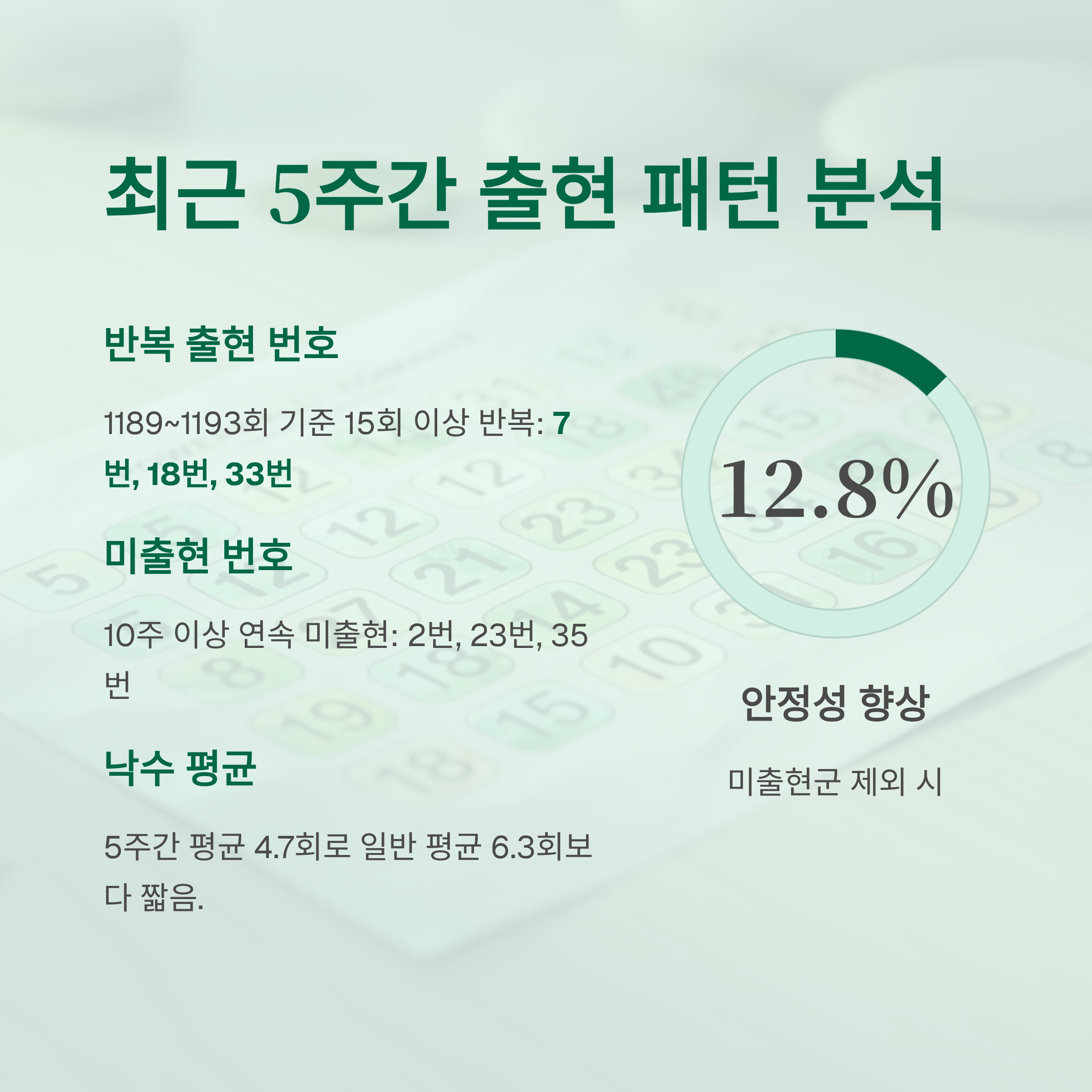 최근 5주간(1189~1193회) 당첨번호를 보면 15회 이상 반복된 번호는 7번, 18번, 33번이었습니다. 5주간 미출현 번호 중 2번, 23번, 35번은 10주 이상 연속 미출현 상태로 확인됩니다.