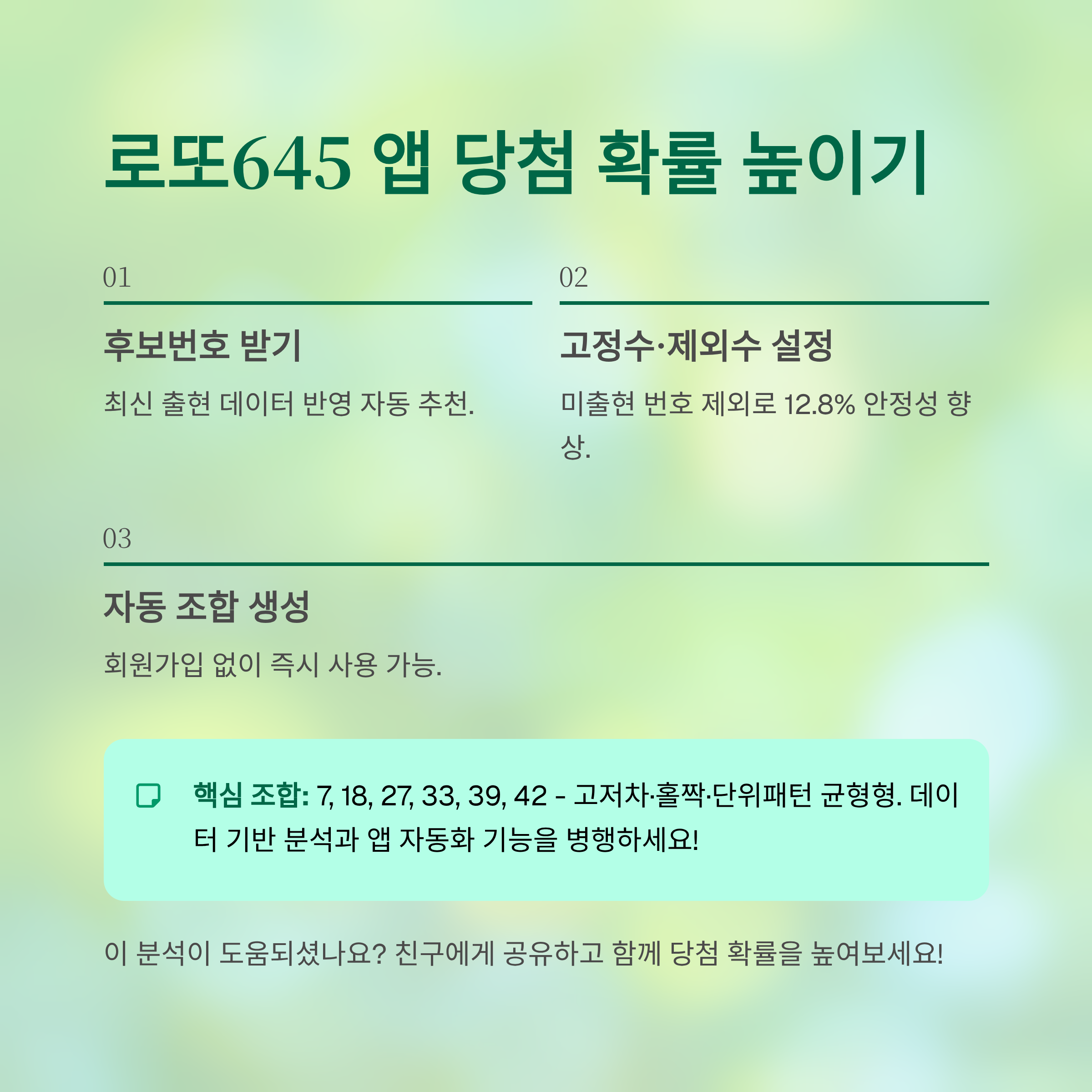 로또645 앱의 “상세 조합 생성” 기능에서 ‘후보번호 받기’를 실행하면 최근 5주간 출현비율을 반영한 자동 추천번호가 생성됩니다. 앱이 제시한 후보번호군(7, 18, 20, 33, 39, 42)을 바탕으로 산술 복합도(AC값 7~8 범위) 분석을 병행했습니다.