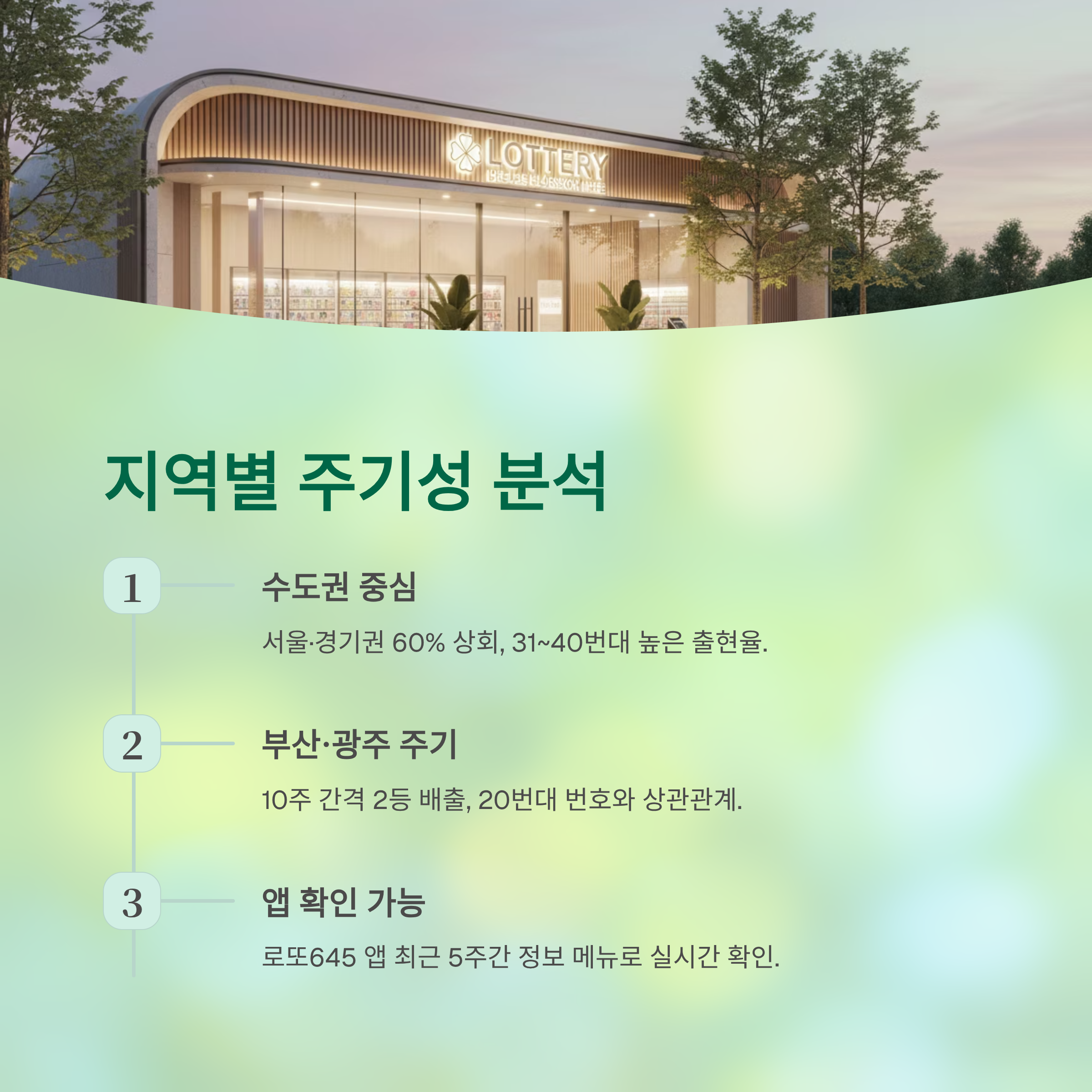 부산과 광주는 10주 간격으로 2등 배출 빈도가 높았으며, 20번대 번호의 빈출과 상관관계를 보였습니다. 이와 같은 주기성은 로또645 앱의 “최근 5주간 정보” 메뉴로 확인 가능합니다.