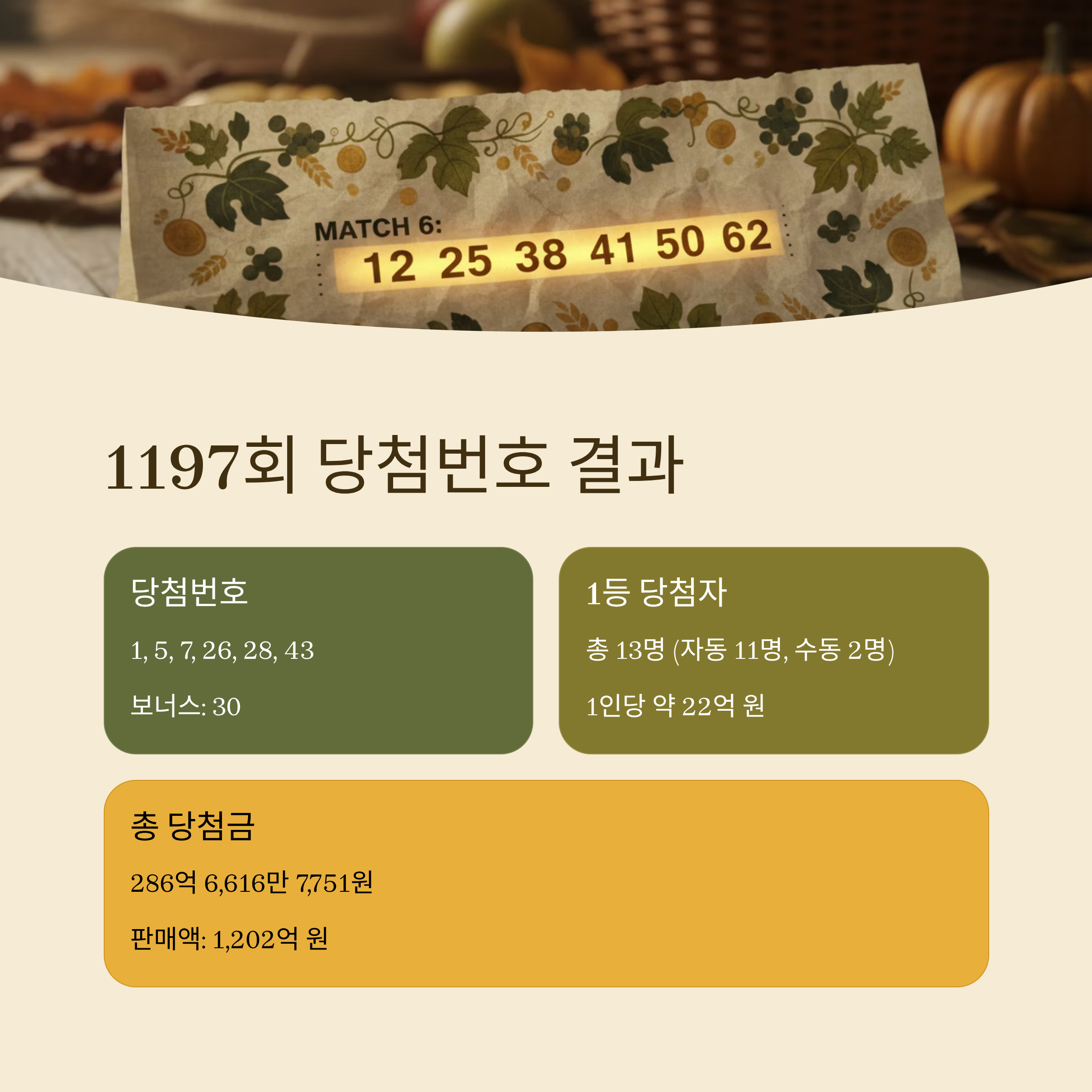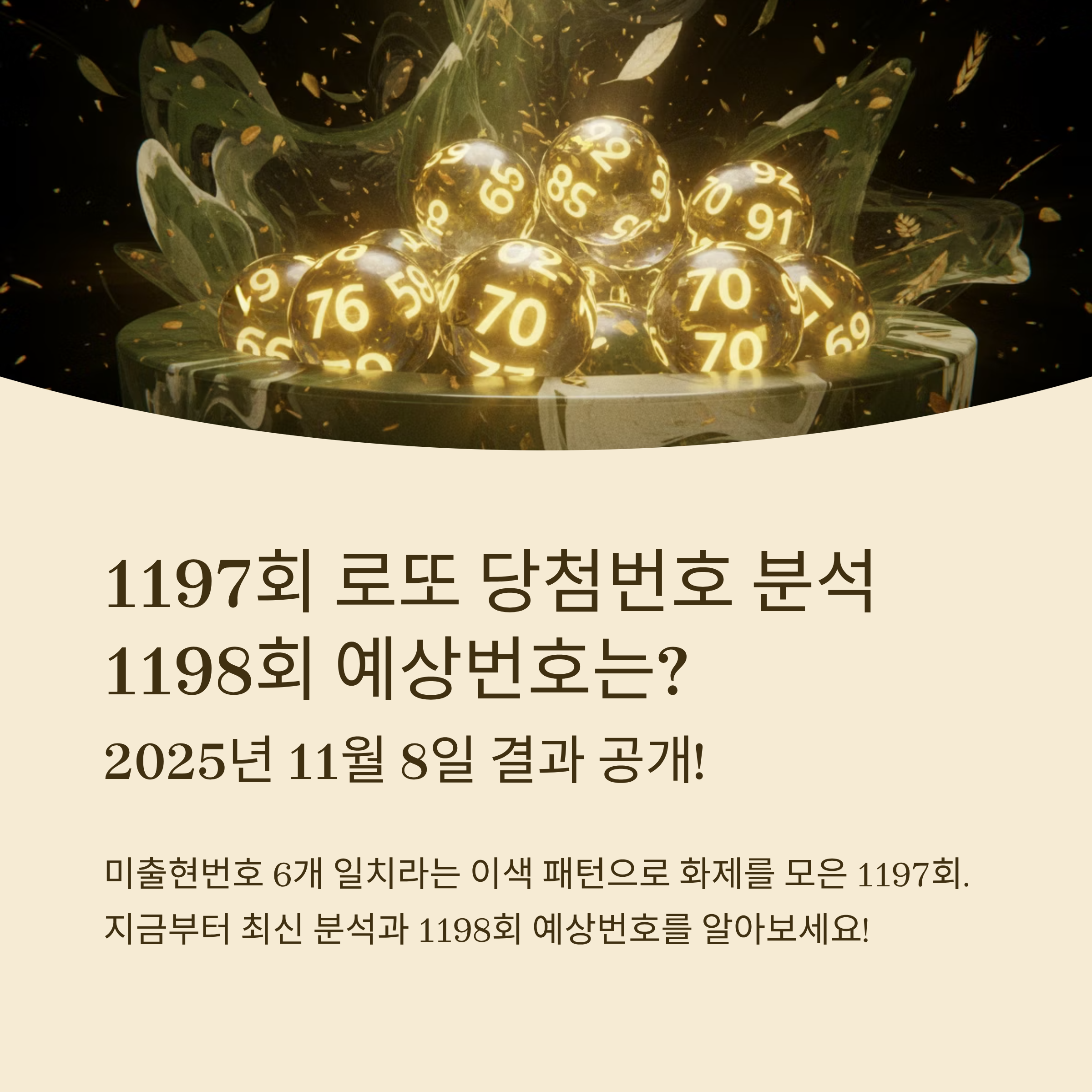 2025년 11월 8일 진행된 1197회 로또 당첨번호 1, 5, 7, 26, 28, 43 + 보너스 30이 공개되자마자 수많은 분들이 결과를 확인하느라 분주했죠. 이번 회차는 미출현번호 6개 일치라는 이색 패턴으로 화제를 모았는데요, 과연 1198회 로또 예상번호는 어떤 흐름을 따를까요?