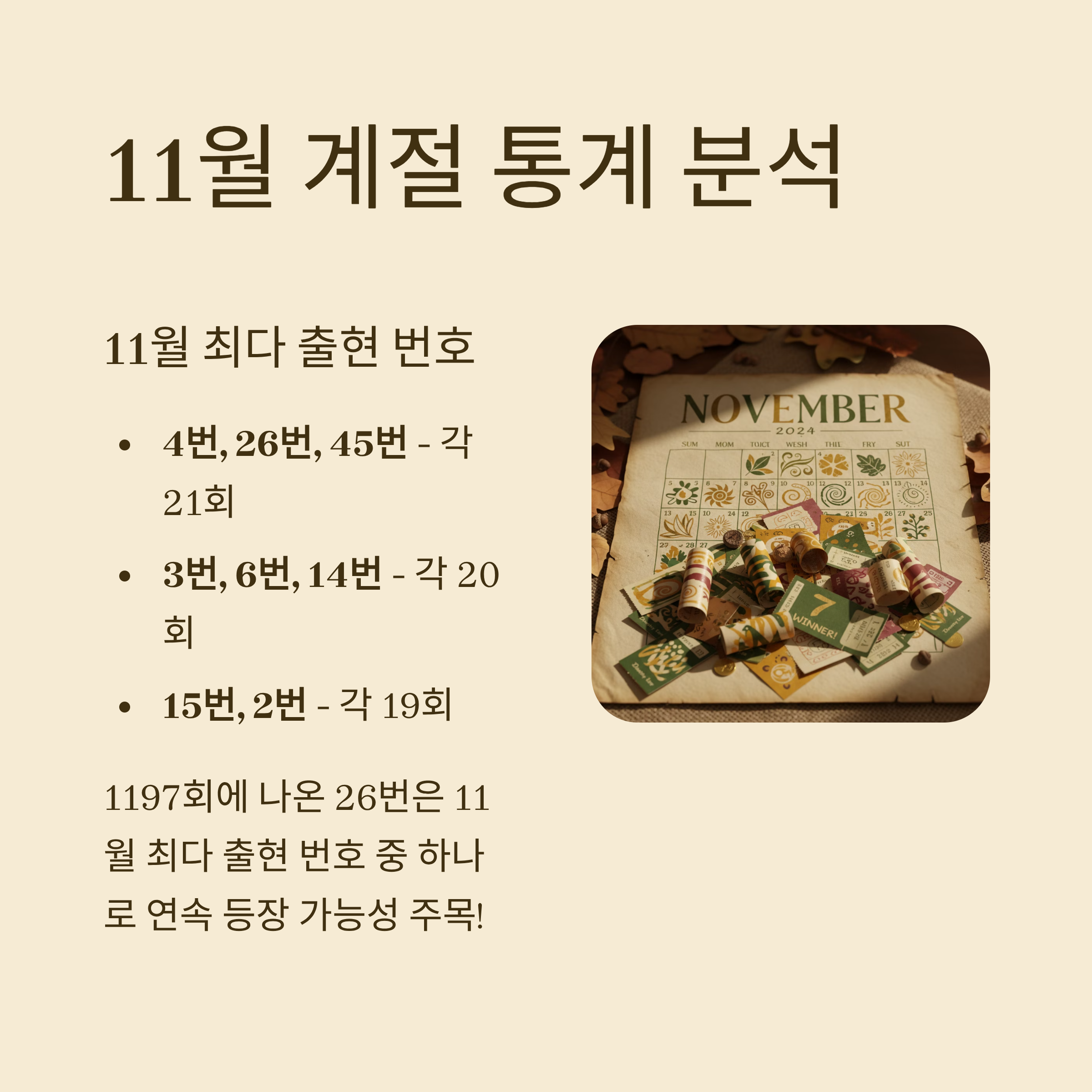 1197회에 나온 26번은 11월 최다 출현 번호 중 하나로, 연속 등장 가능성도 주목할 만합니다.