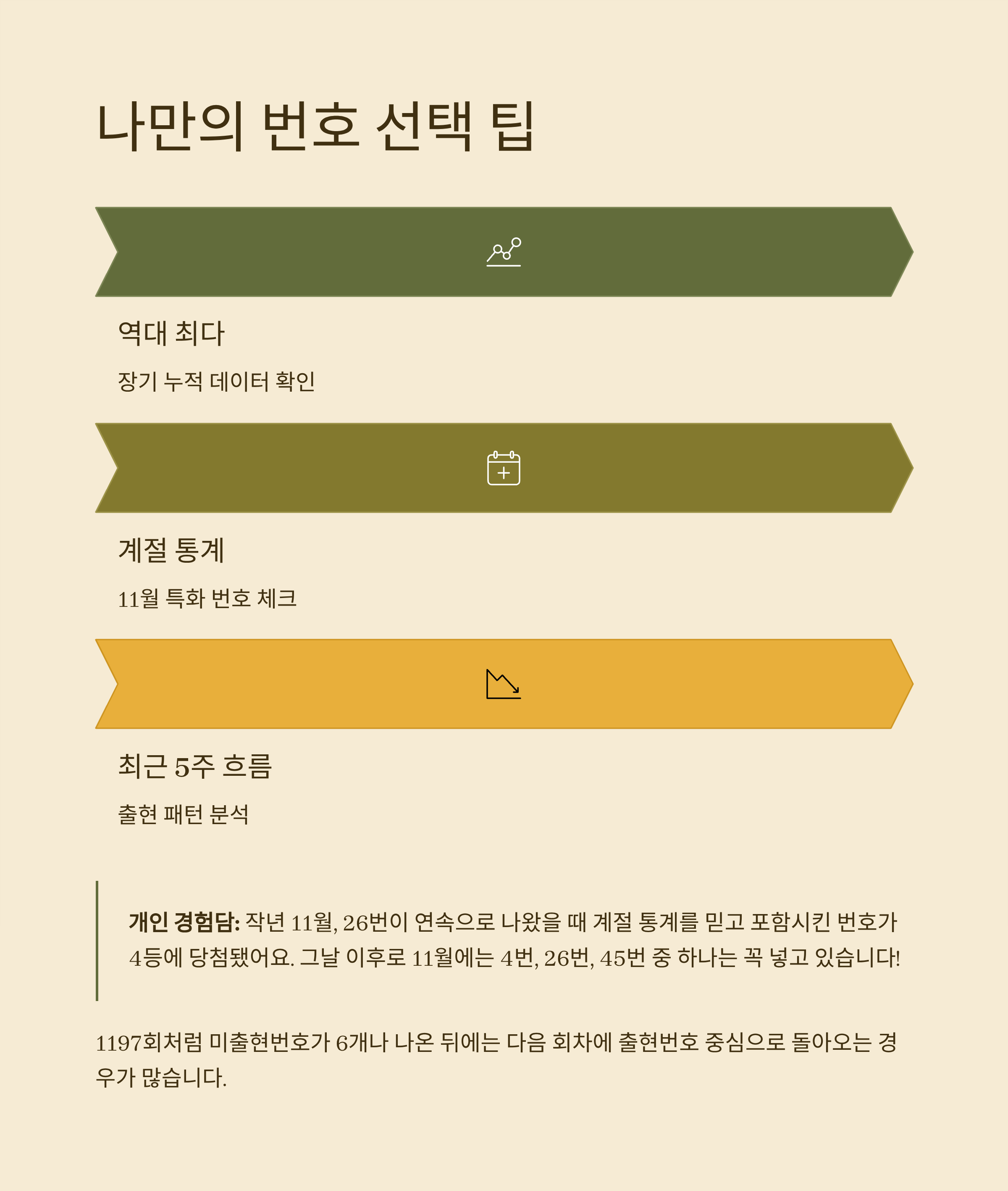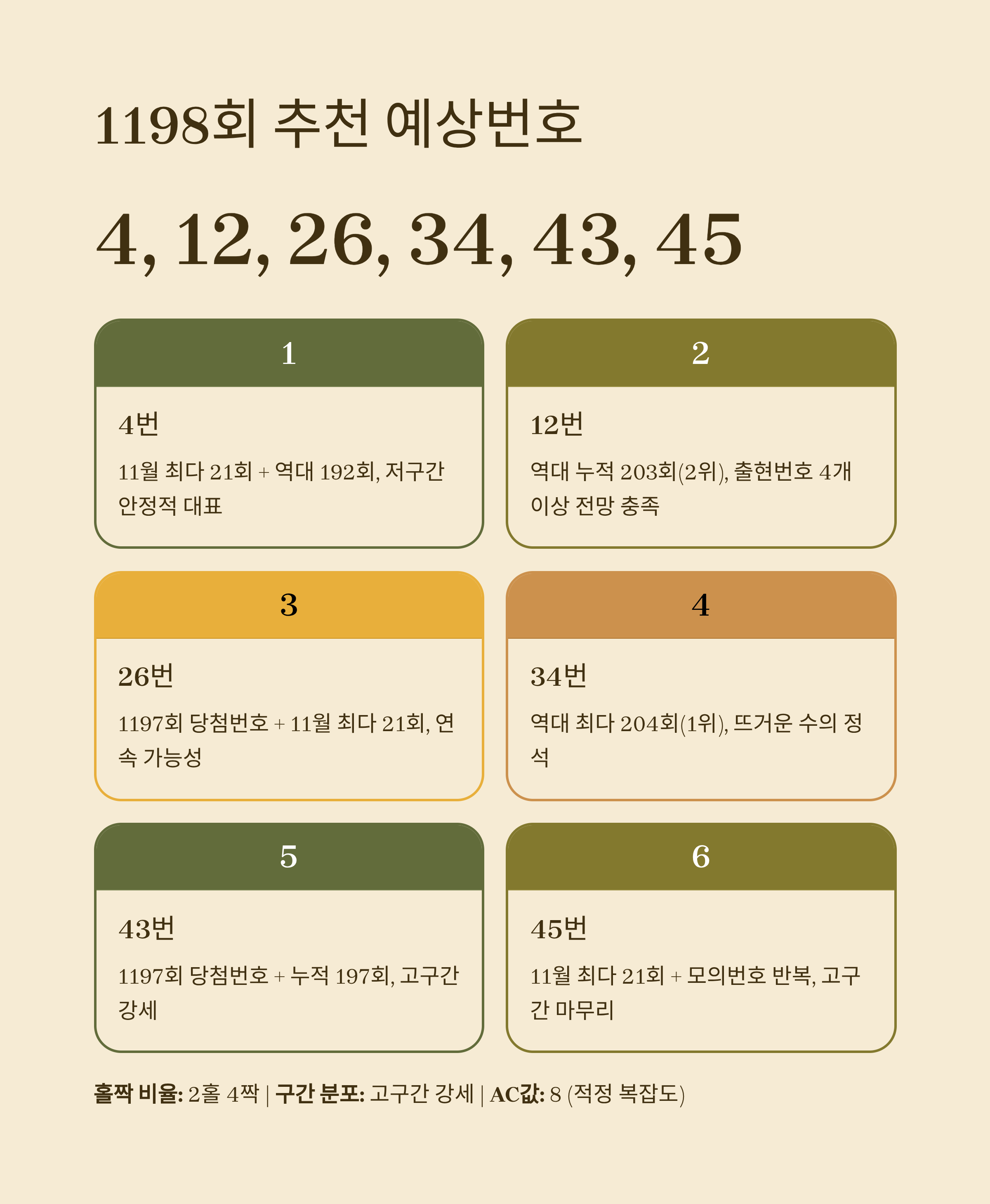 | 26 | 1197회 당첨번호 포함 + 11월 최다 21회, 연속 가능성 |