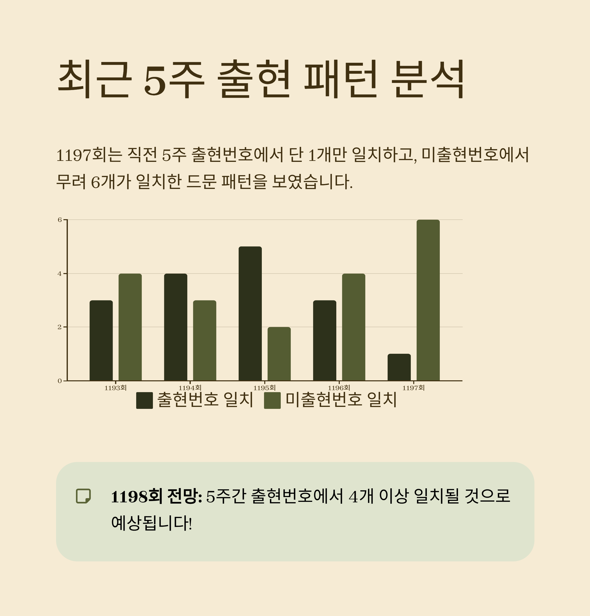 최근 5주간 당첨번호와 미출현번호 간의 일치 개수를 분석하면, 1198회 흐름을 예측하는 데 큰 도움이 됩니다.