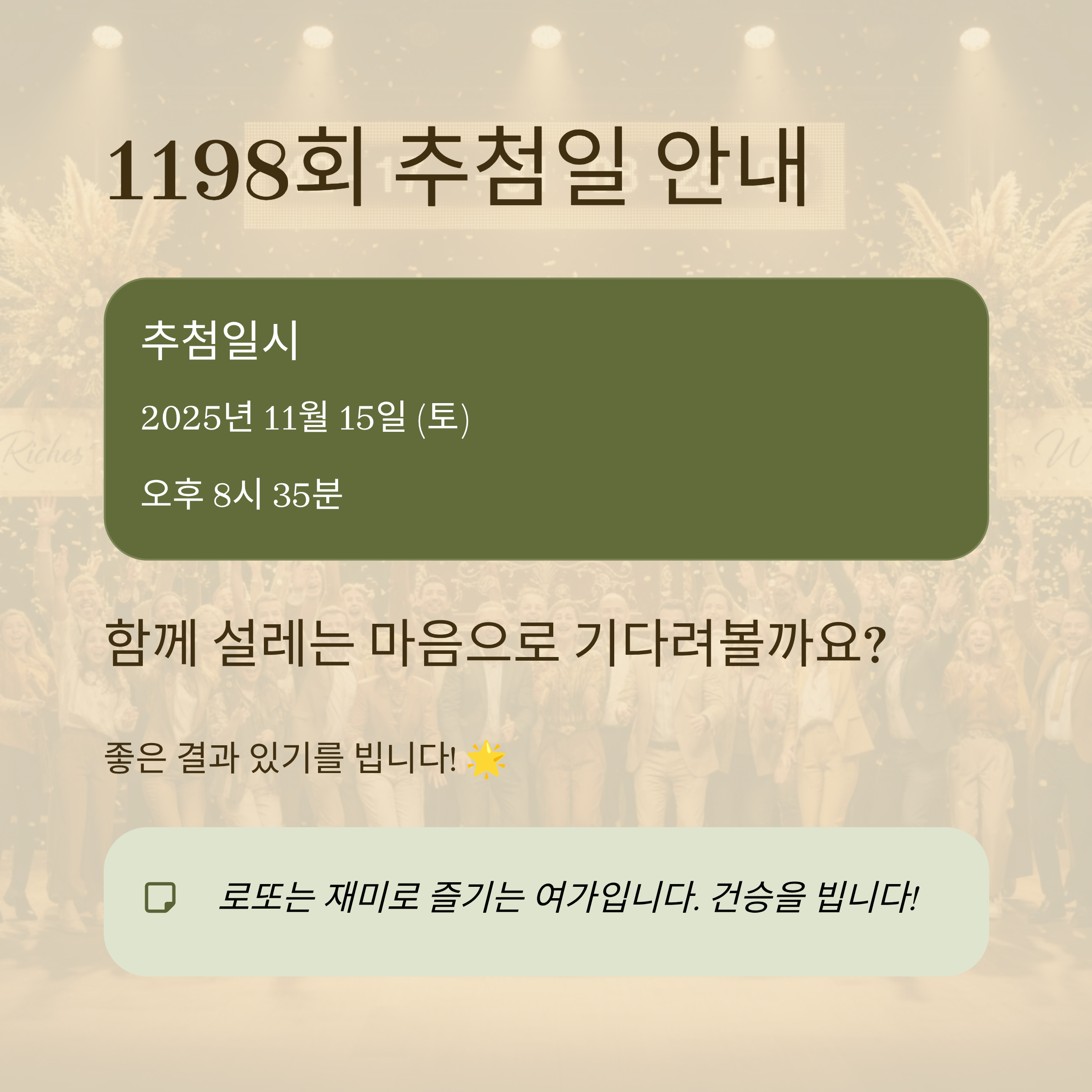 1198회 추첨일: 2025년 11월 15일 (토) 오후 8시 35분