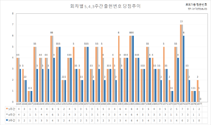 출현번호 통계에서 번호대별로 3주간 당첨된 숫자를 확인할 수 있습니다. 1 ~ 10번대에서 8개 번호가 나왔군요.