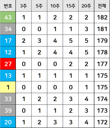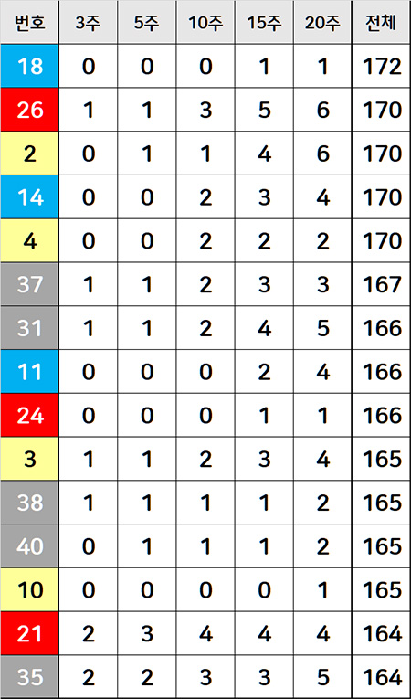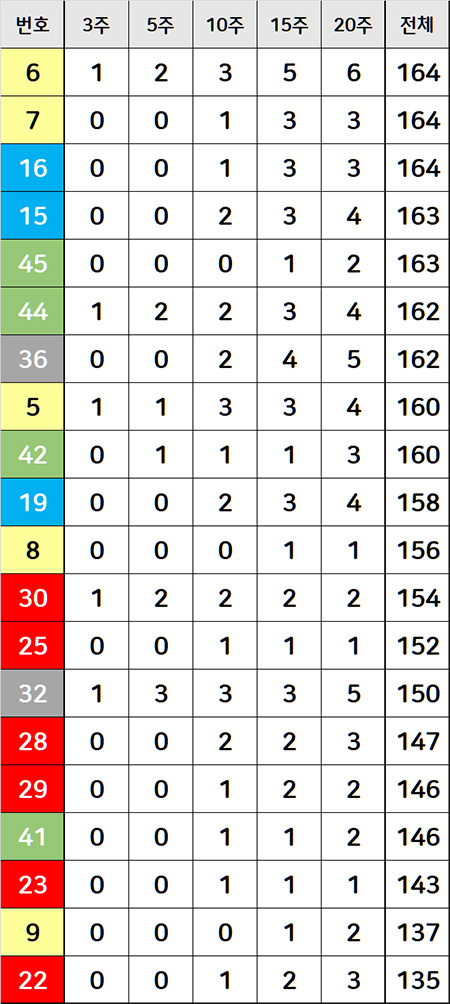 로또 번호 1번 ~ 45번까지 역대 전체 당첨횟수를 조사하였고, 최근 3주 5주 10주 15주 20주 기간 동안 당첨된 횟수를 집계하여 표시한 자료입니다.