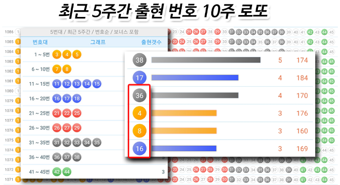 10주 최다 상위권 2개 번호는 제외시키고, 나머지 4개 번호에서 로또당첨예상번호 후보를 결정하면 되겠습니다.