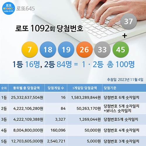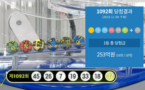 1092회 로또 당첨번호 추첨결과 1등 총당첨금은 253억원으로 집계되었고, 1등 16명은 개인별로 약 16억원의 당첨금을 받게 됩니다.