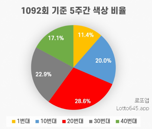로또 1093회 당첨 예상번호 분석하기 위해 최근 5주 동안 로또645 복권에 당첨된 번호들을 색상 비율로 확인했습니다. 빨강색 번호가 28.6% 비율로 가장 많습니다.
