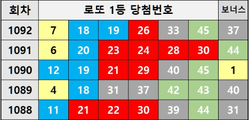 로또 1093회 당첨 예상번호 예측하는데 5주간 당첨번호를 활용하면 더 좋을거 같아서 1088회 ~ 1092회까지 로또 1등 번호와 보너스 내역을 보여드립니다.