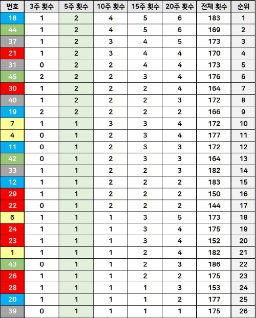 18번 44번 37번 21번 31번 45번 30번 40번 19번 등이 최근 5주 동안 2회씩 당첨된 것으로 파악되었습니다.